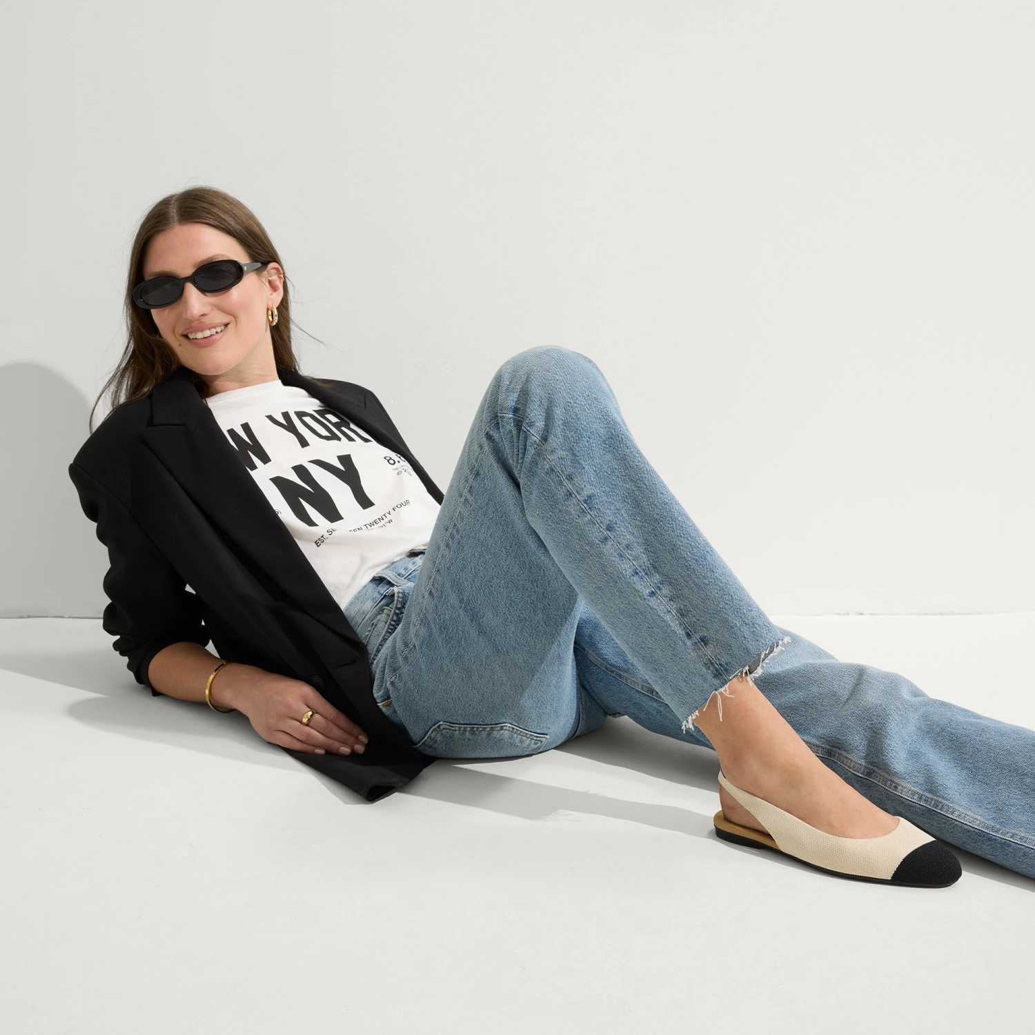 - Soft, flexible upper in ivory and black captoe with an almond-toe profile.