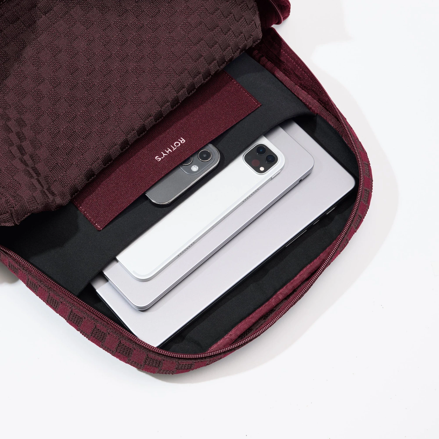 - Sleek design in a deep burgundy basketweave pattern.