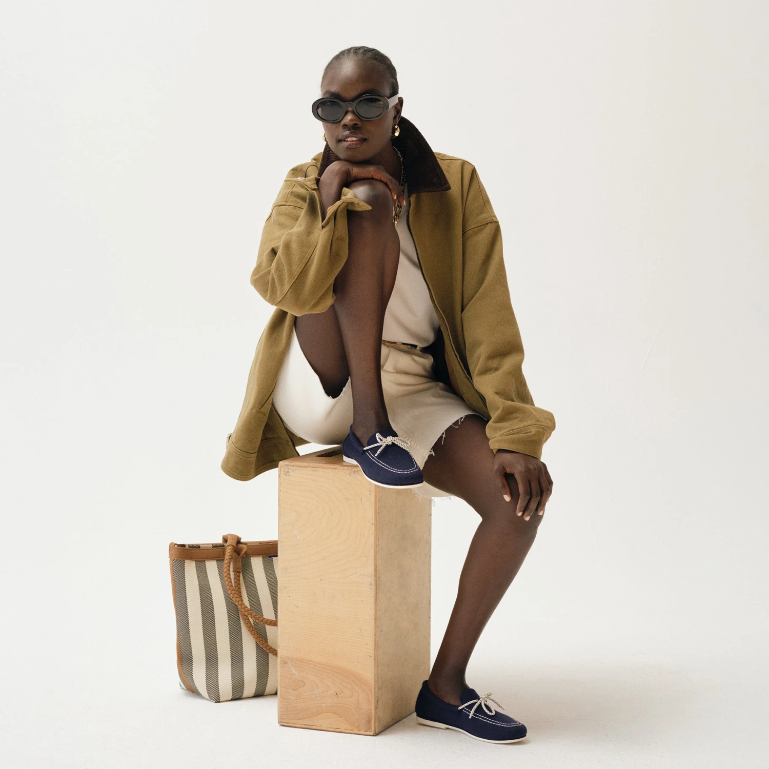 - Adjustable ticking laces in ivory and navy for a nautical-inspired style.