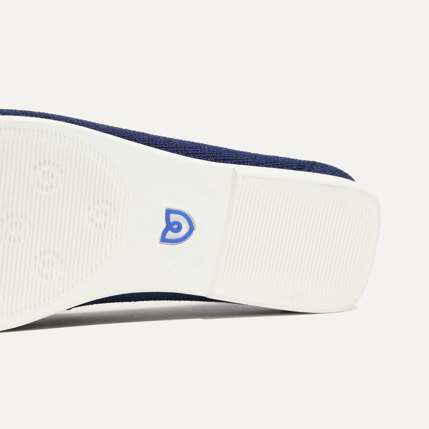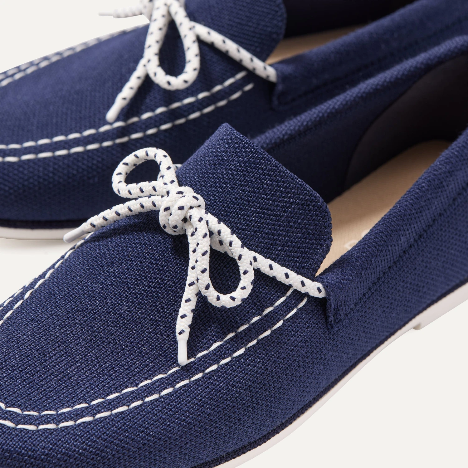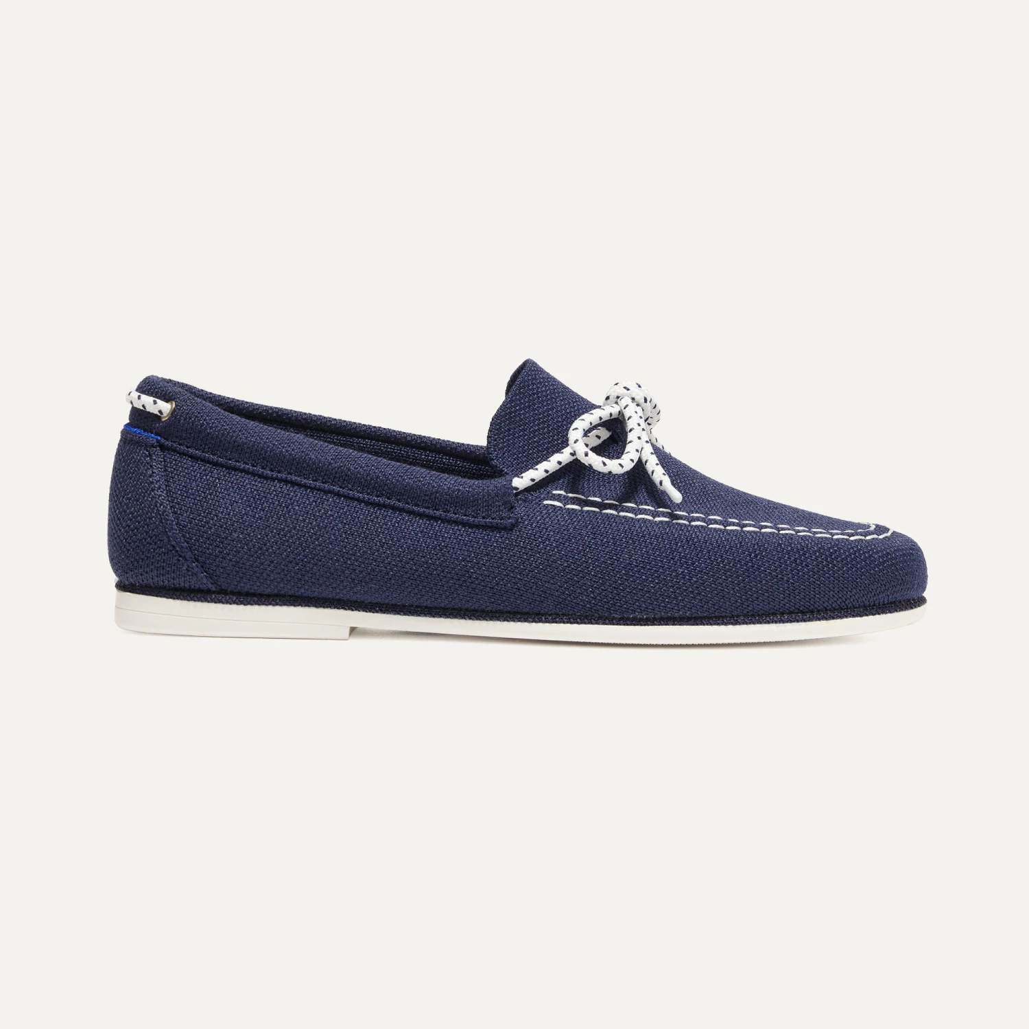 - Knitted, breathable hemp upper in navy with white stitching on the vamp.