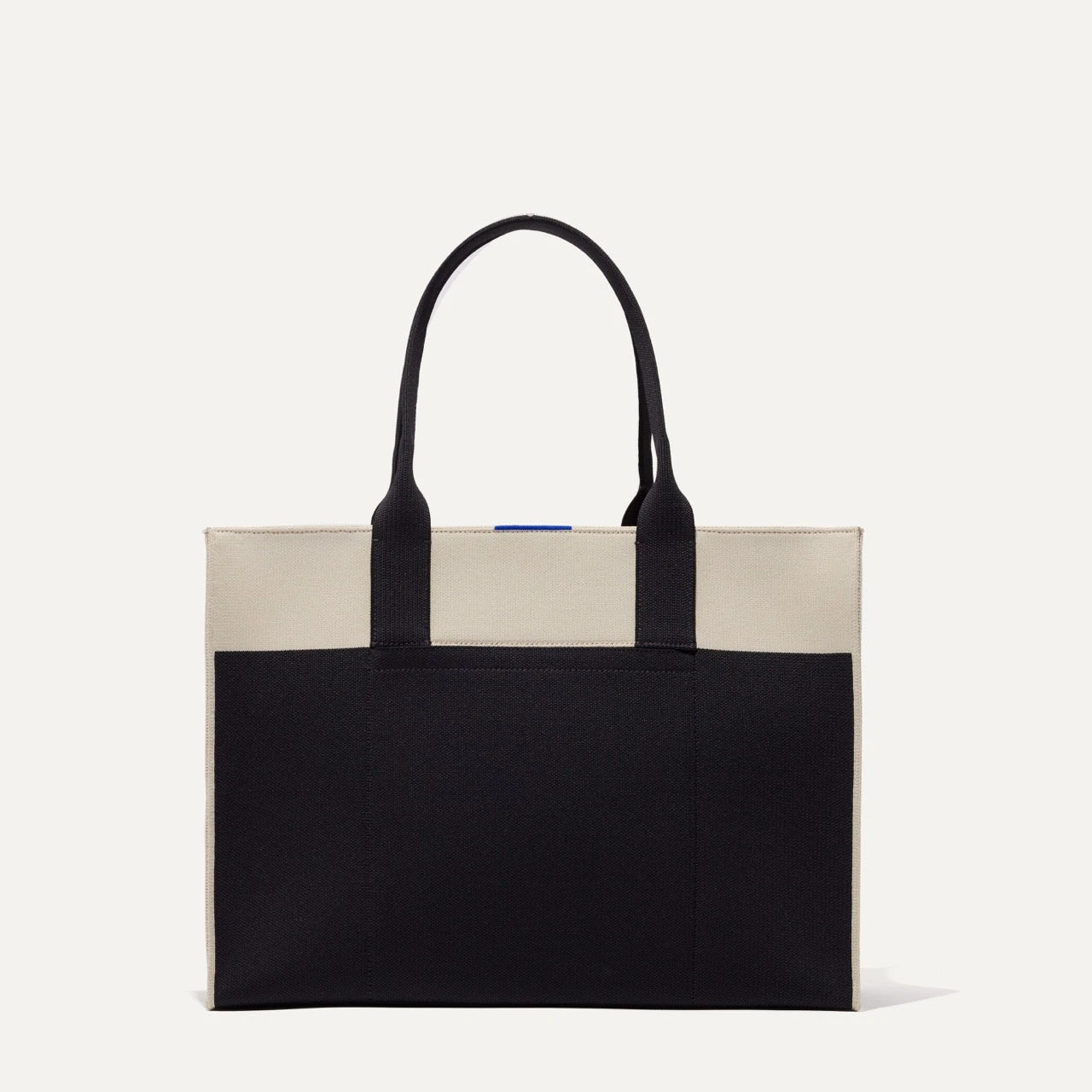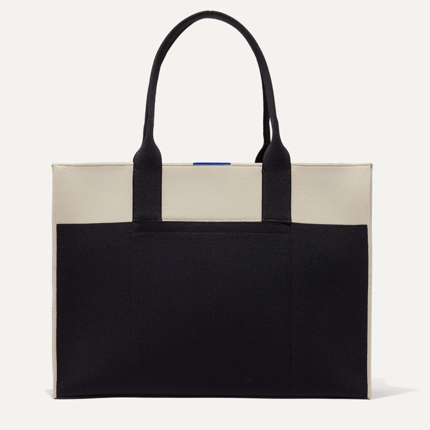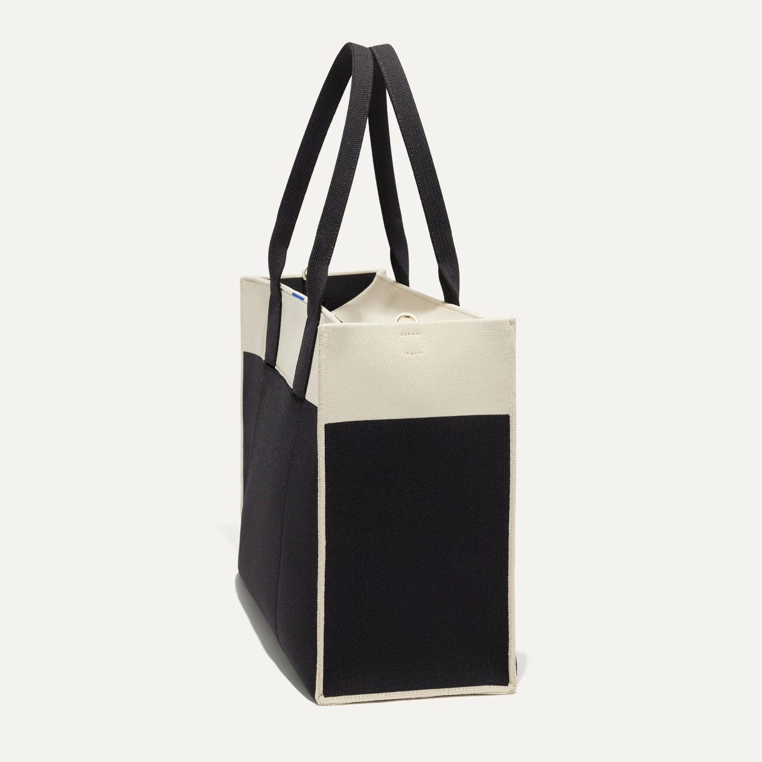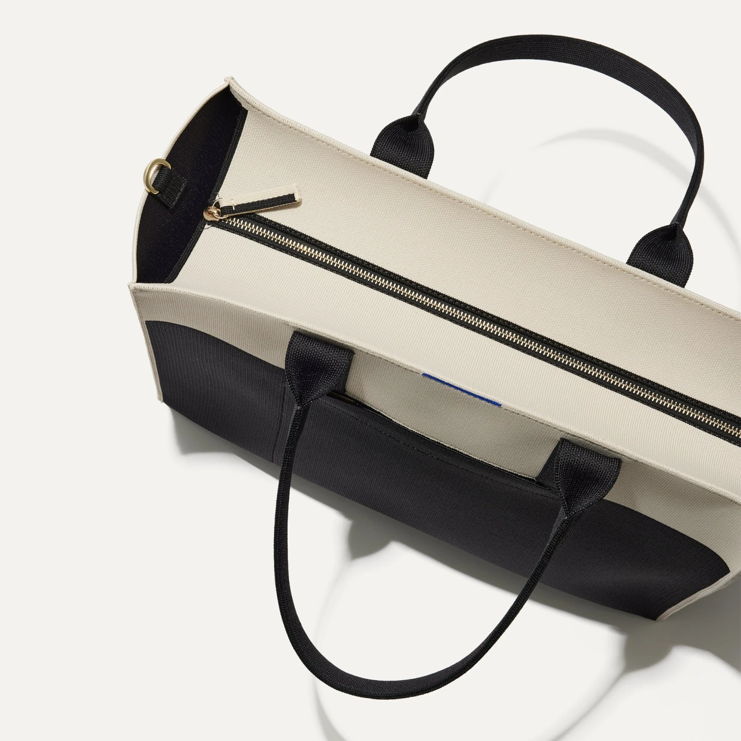 - Boxy, lightweight design in black and ivory, with a secure zipper closure.