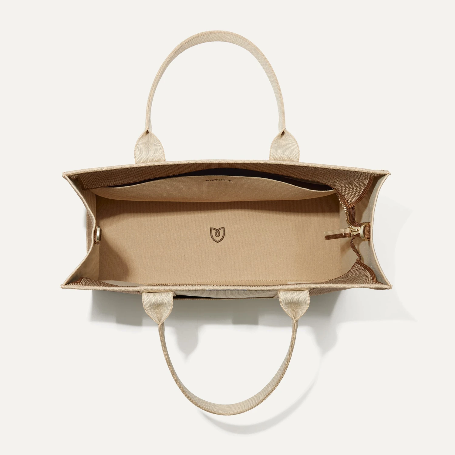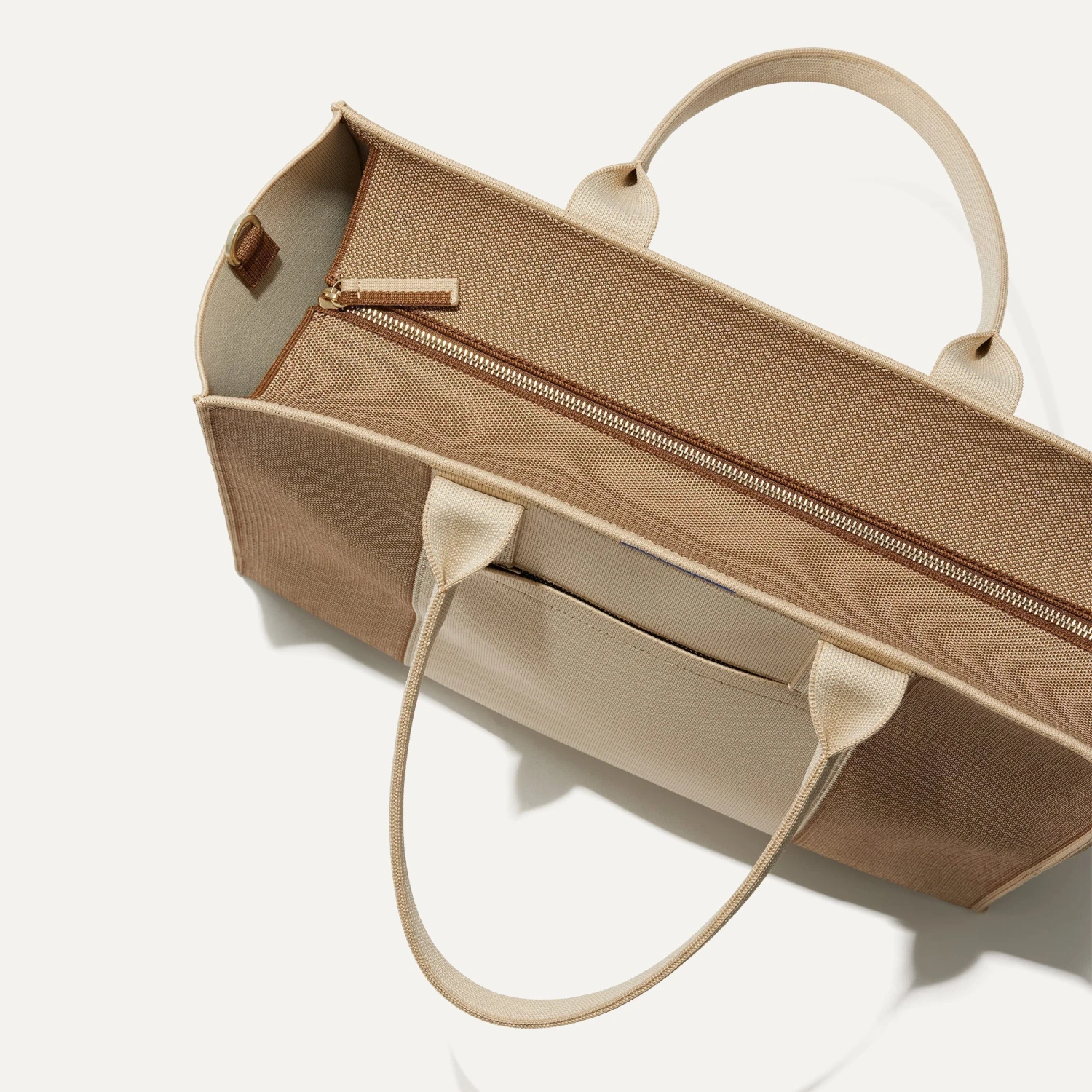 - Boxy, lightweight design in tan and light khaki, with a secure zipper closure.