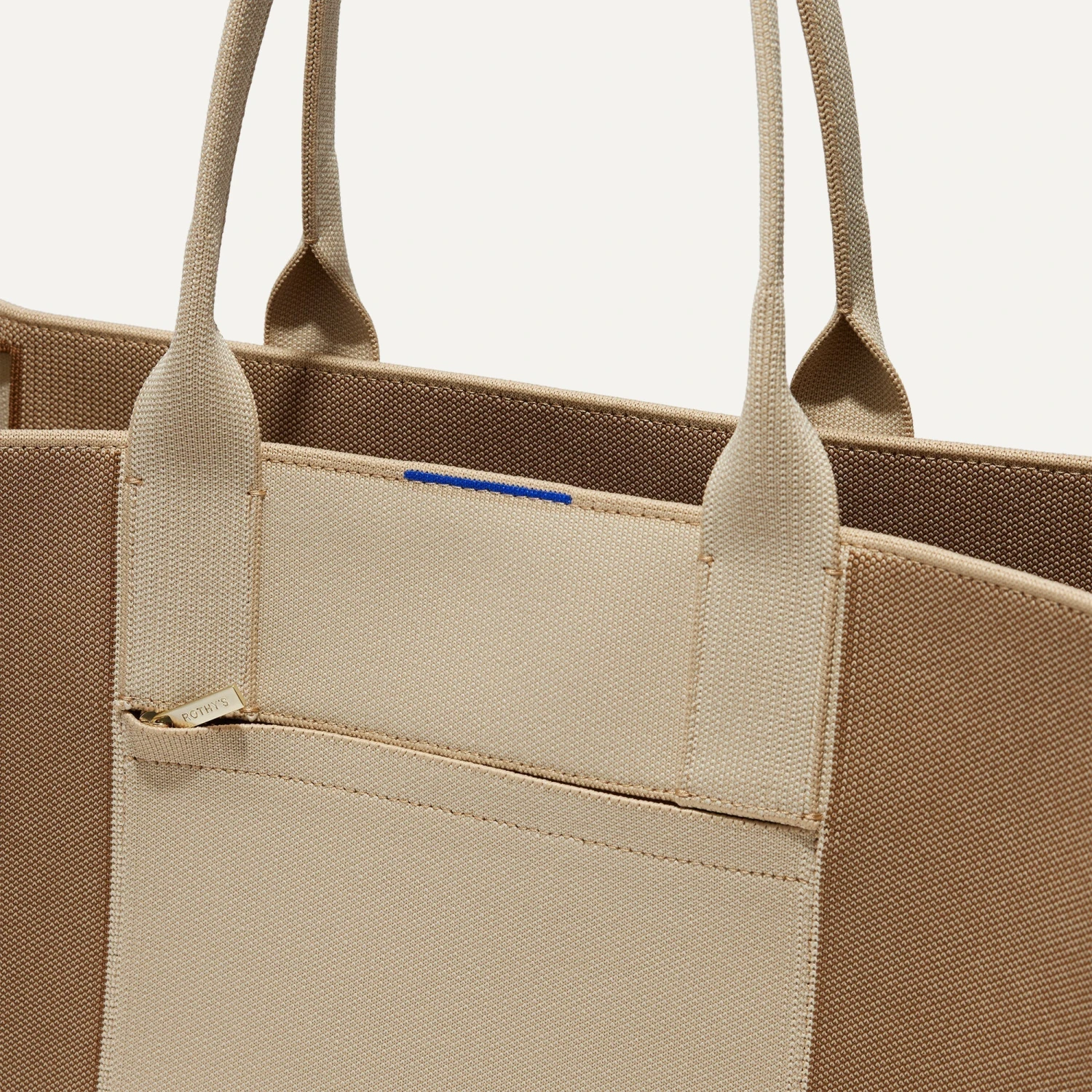 - Durable top handles in light khaki fit comfortably over the shoulder.