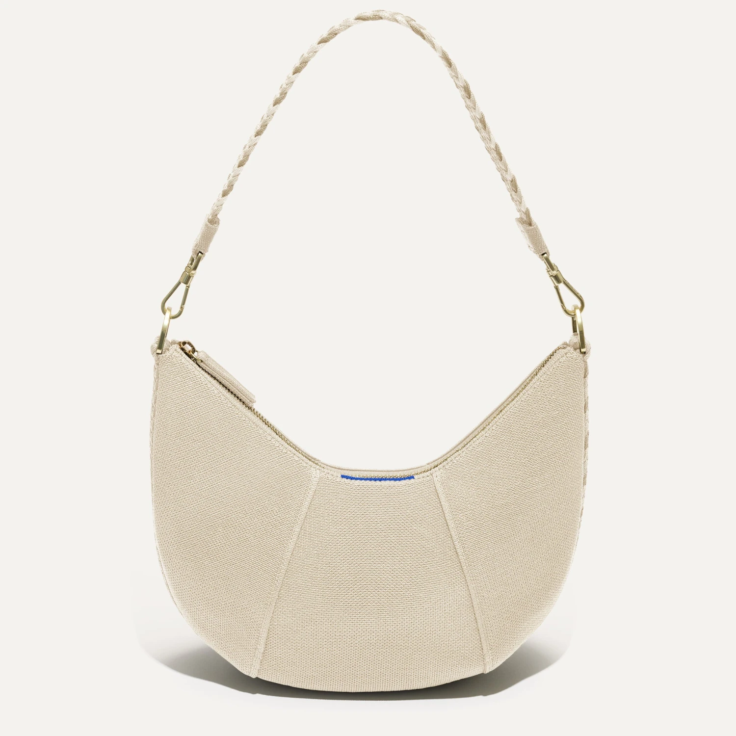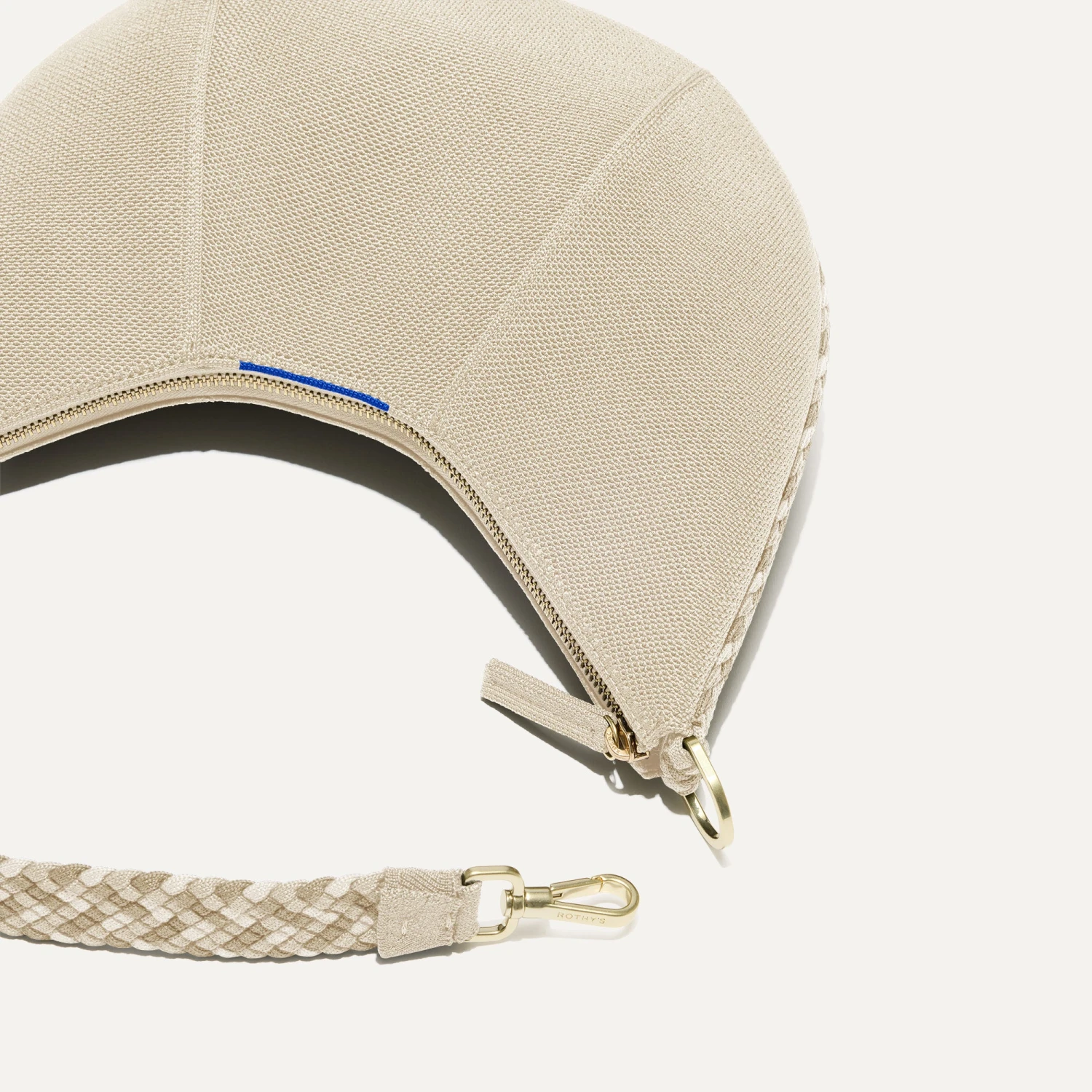- Crescent shape, single-knit style in a ivory with an ivory and beige braided band.