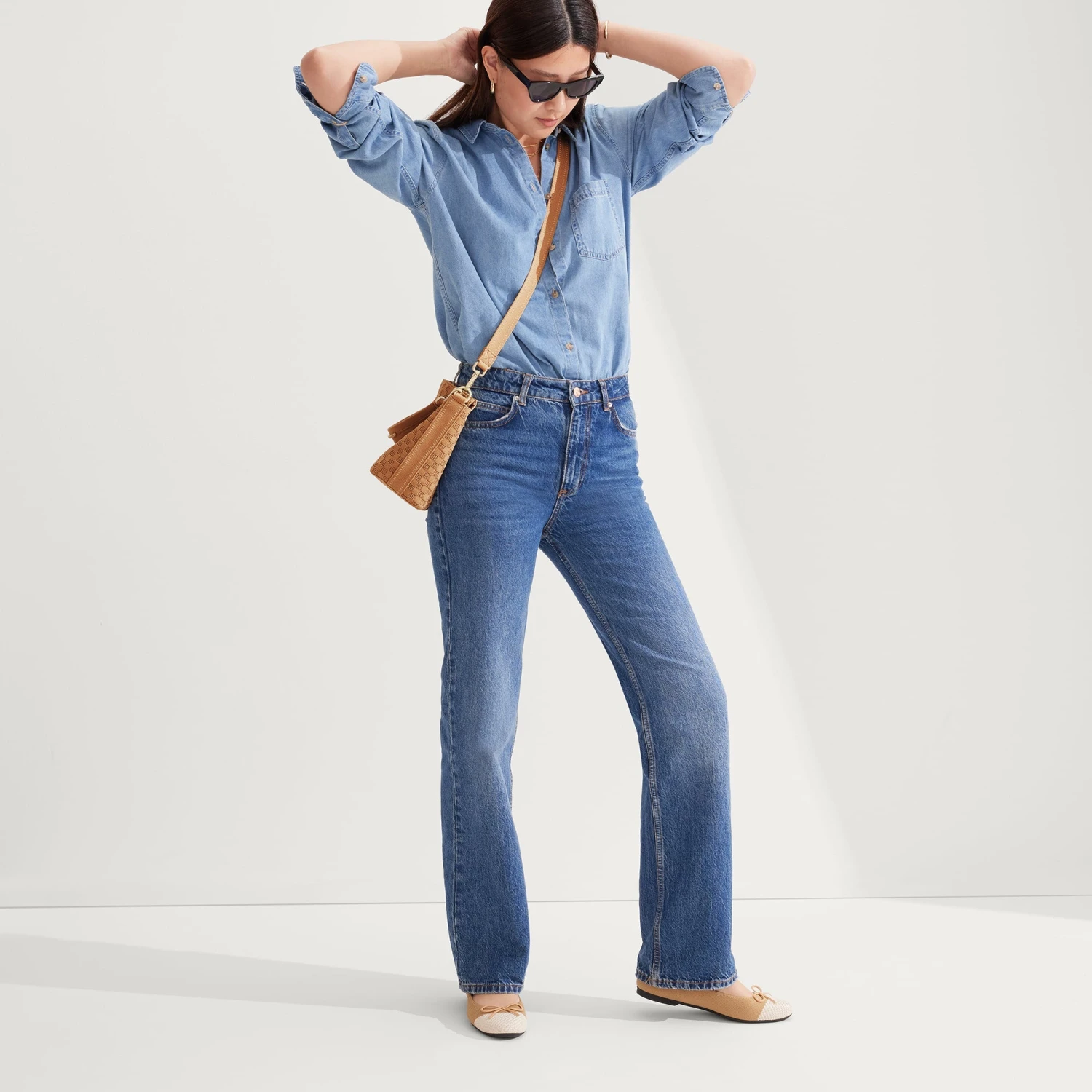 - Detachable, adjustable crossbody strap with an elevated saddle stitch detail in tan.