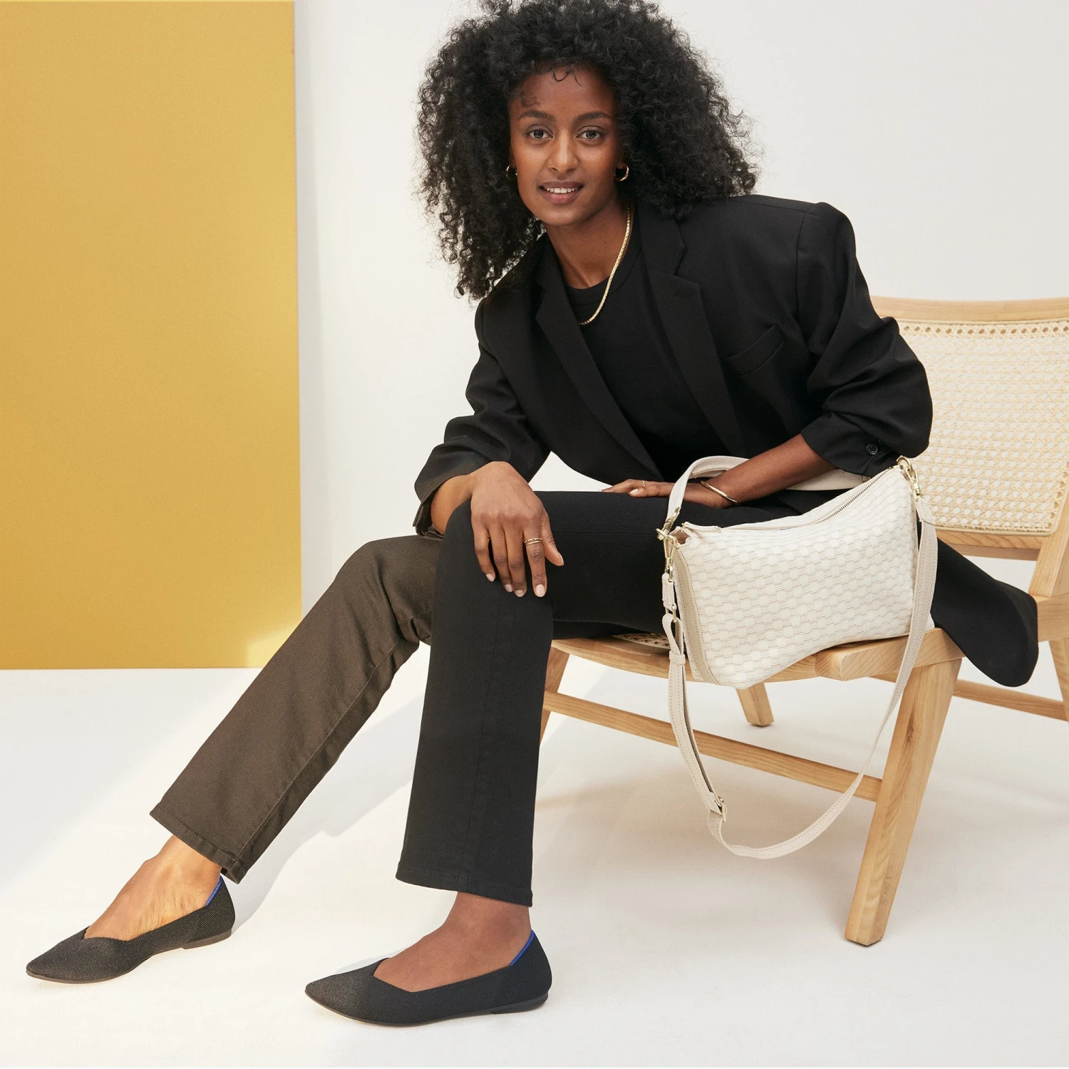 - Detachable, adjustable crossbody strap in black, with an elevated saddle stitch detail.