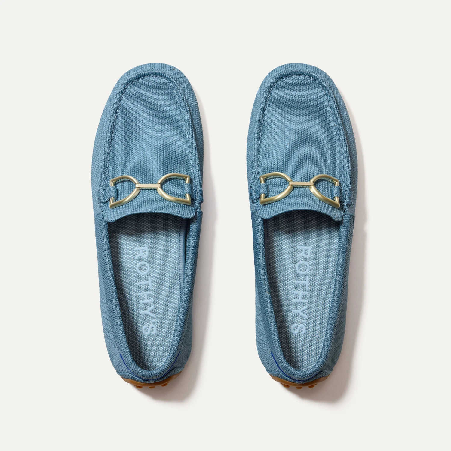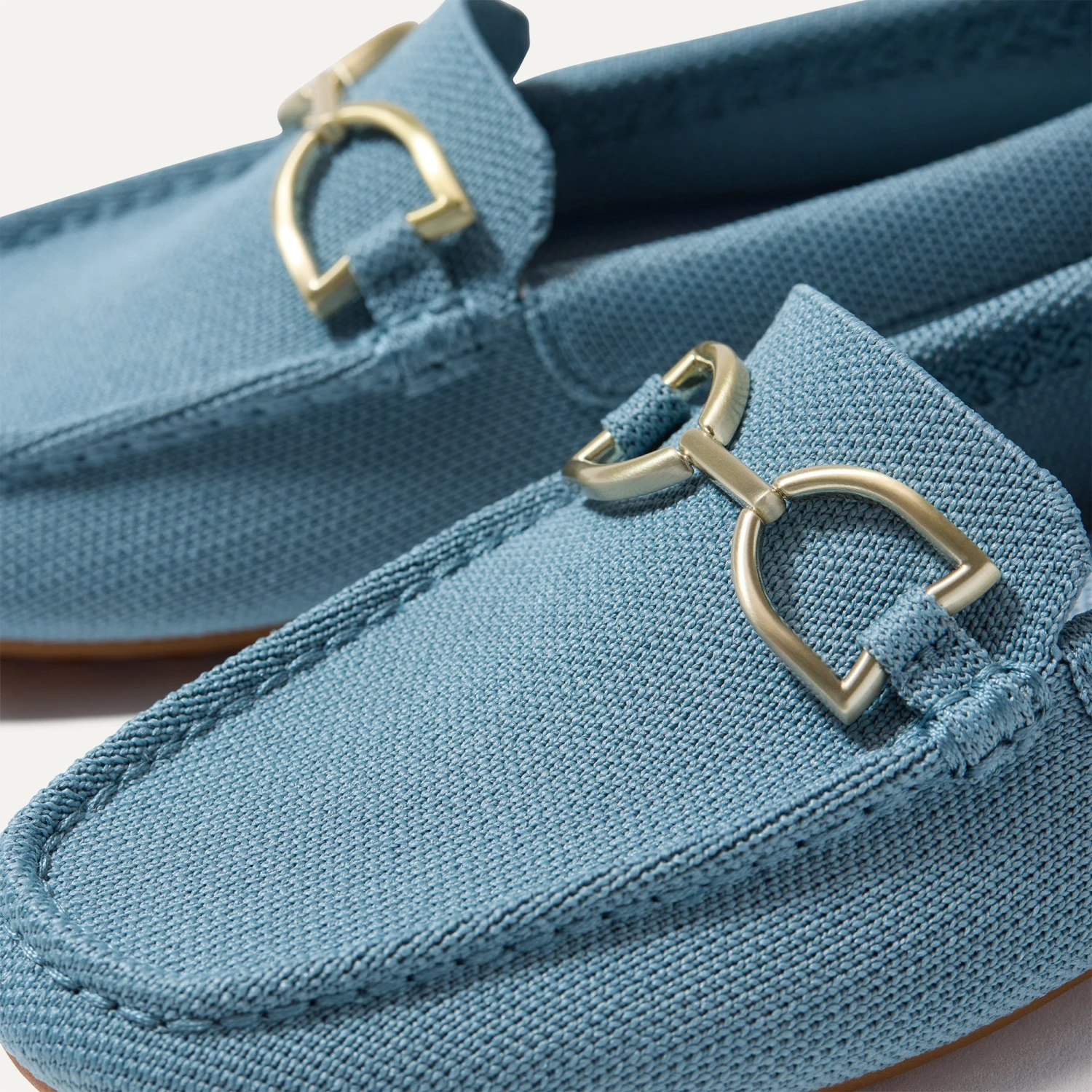 - Soft, flexible upper in sky blue with a gold hardware signet bit on the vamp.