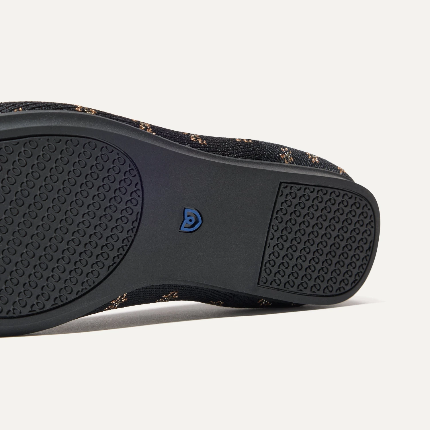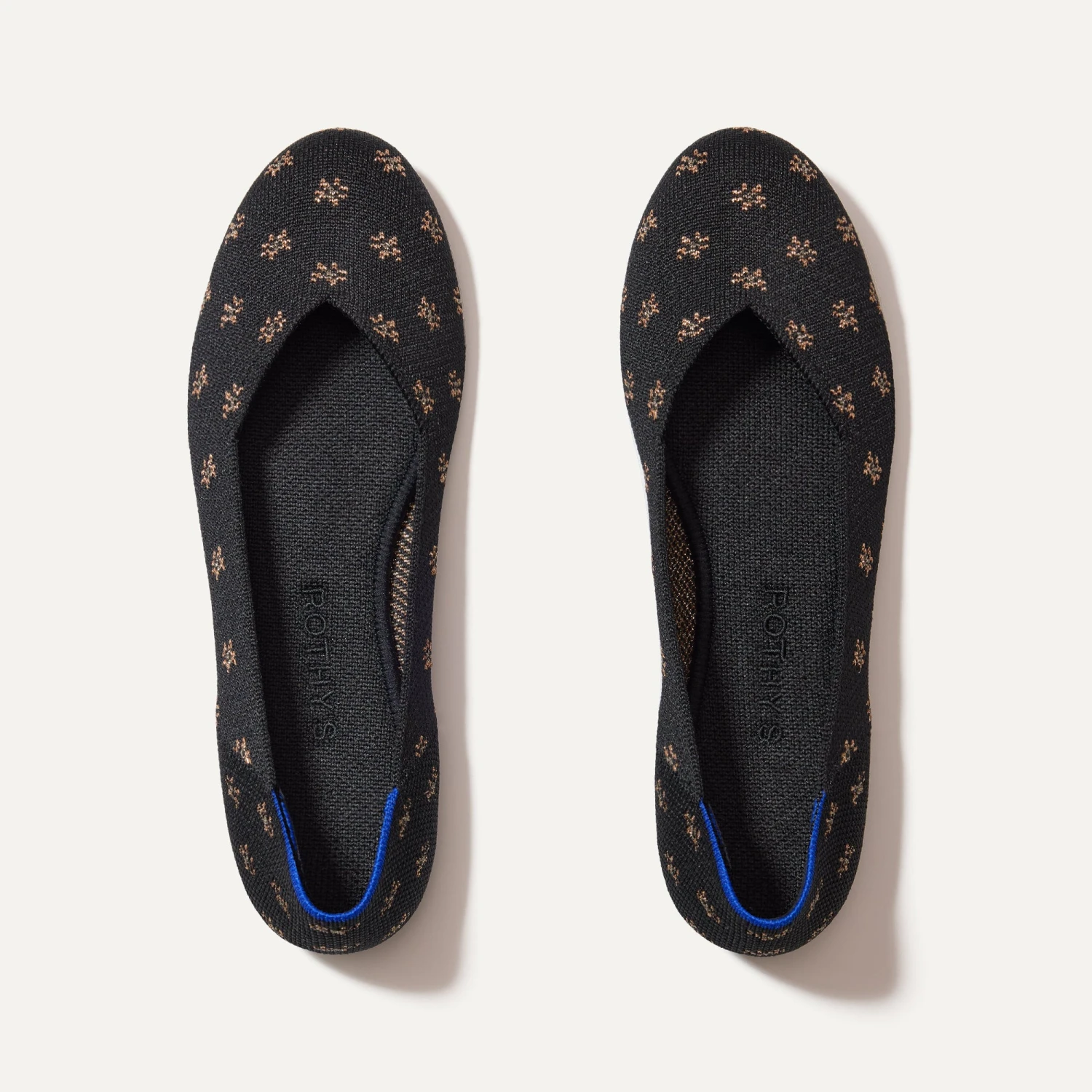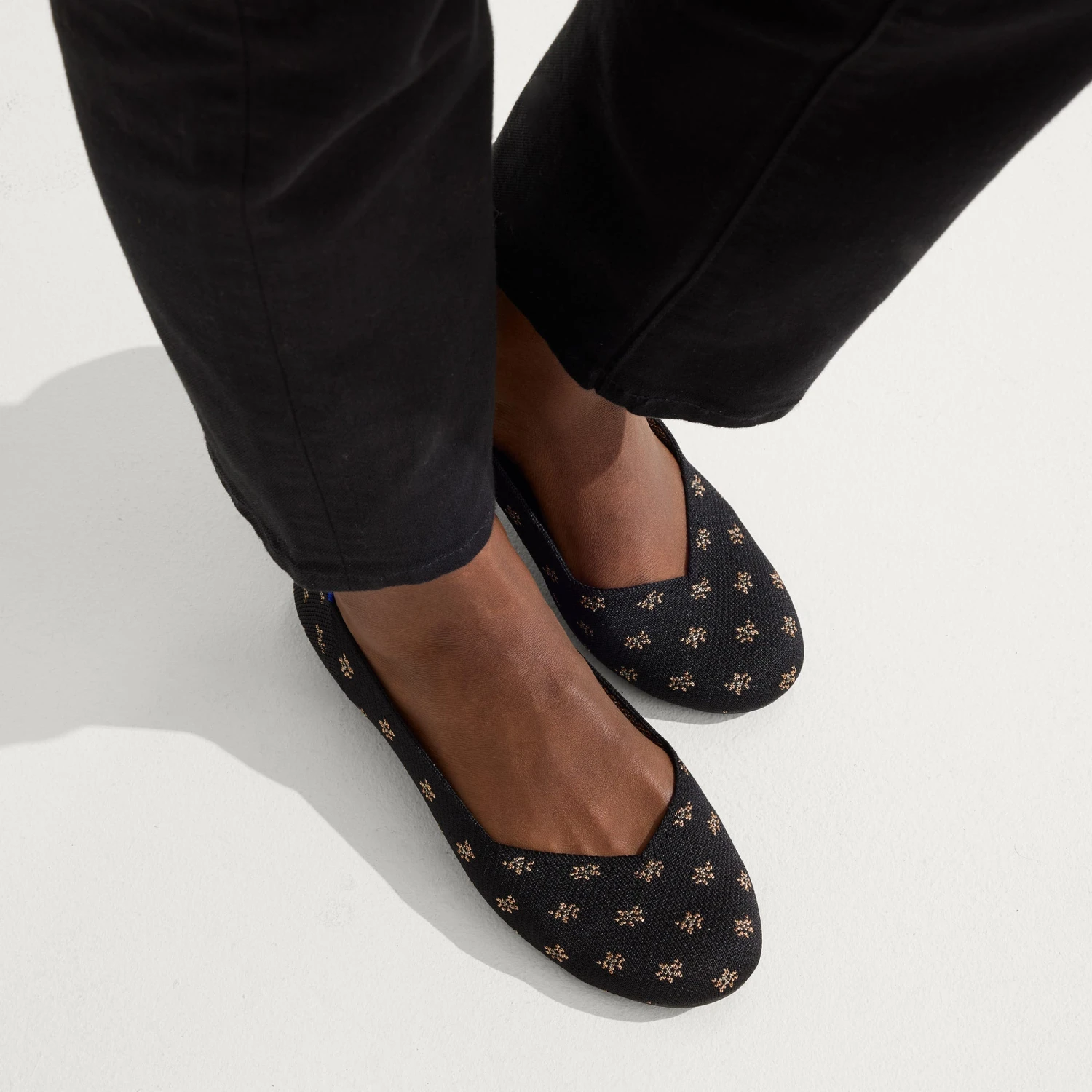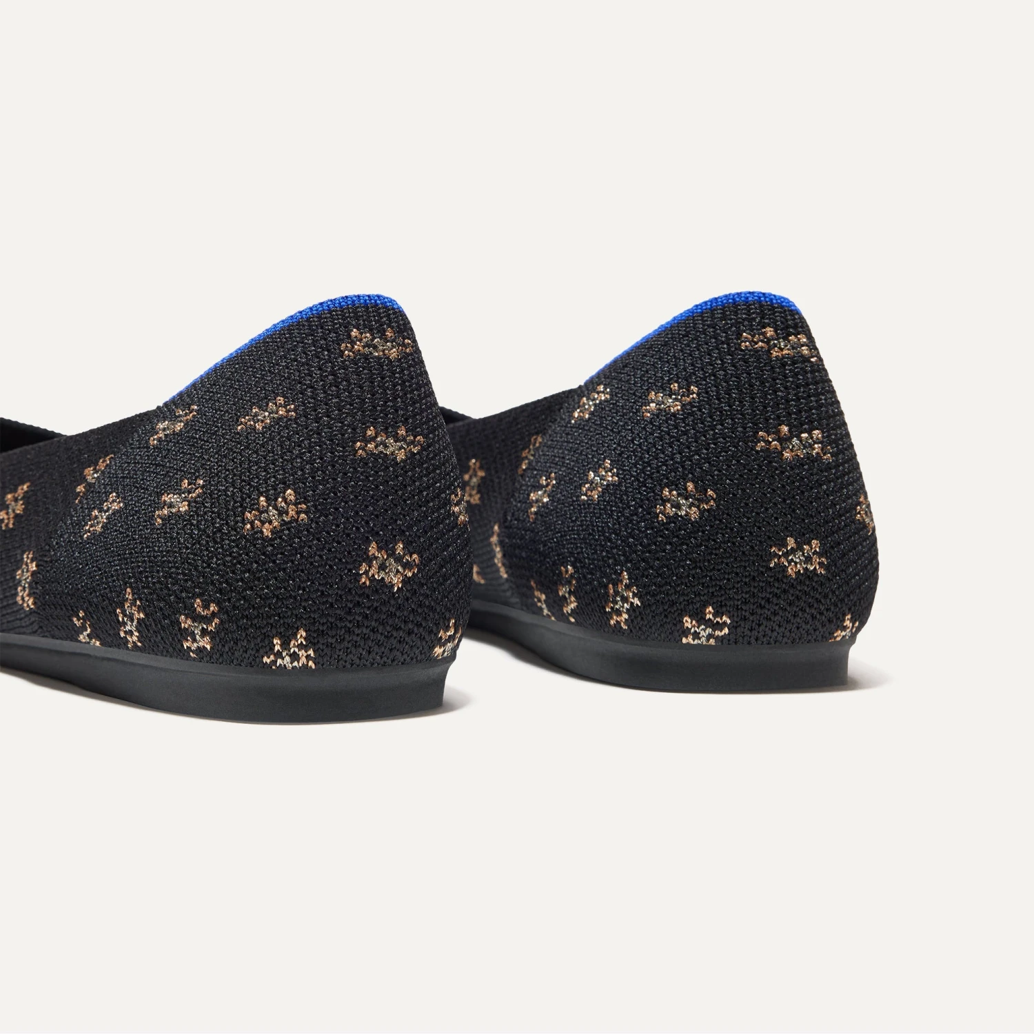 - Soft, flexible upper in black with a shimmery metallic daisy pattern.