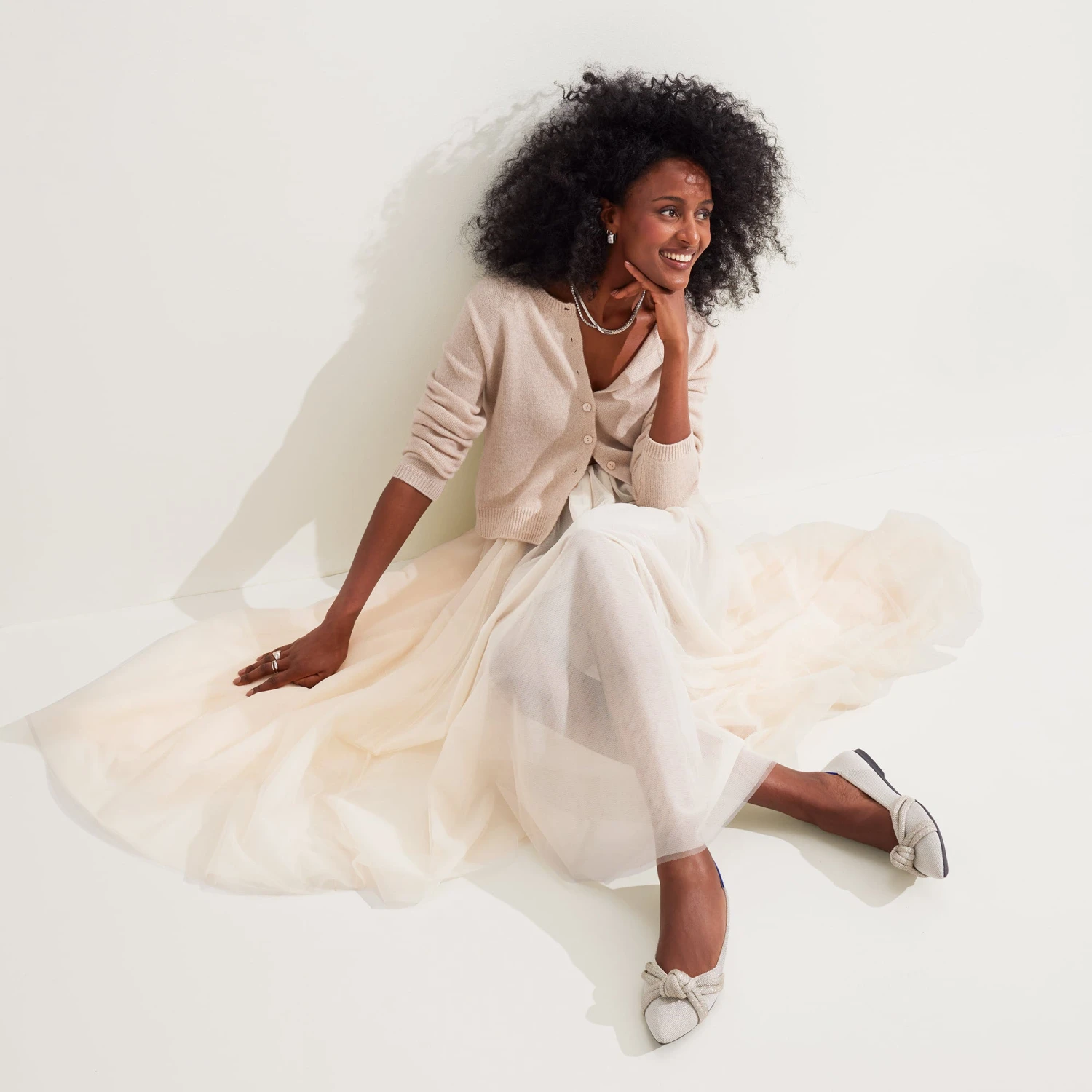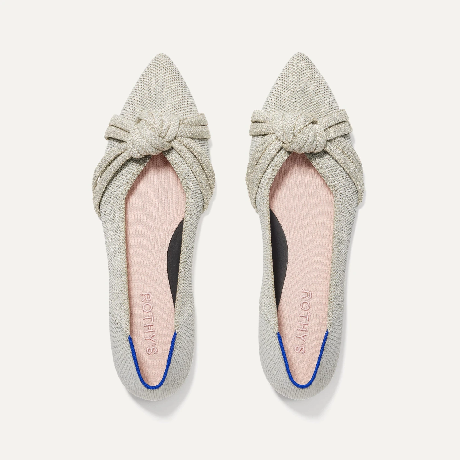 - Premium knit upper in soft platinum shimmer with a knot on the vamp.