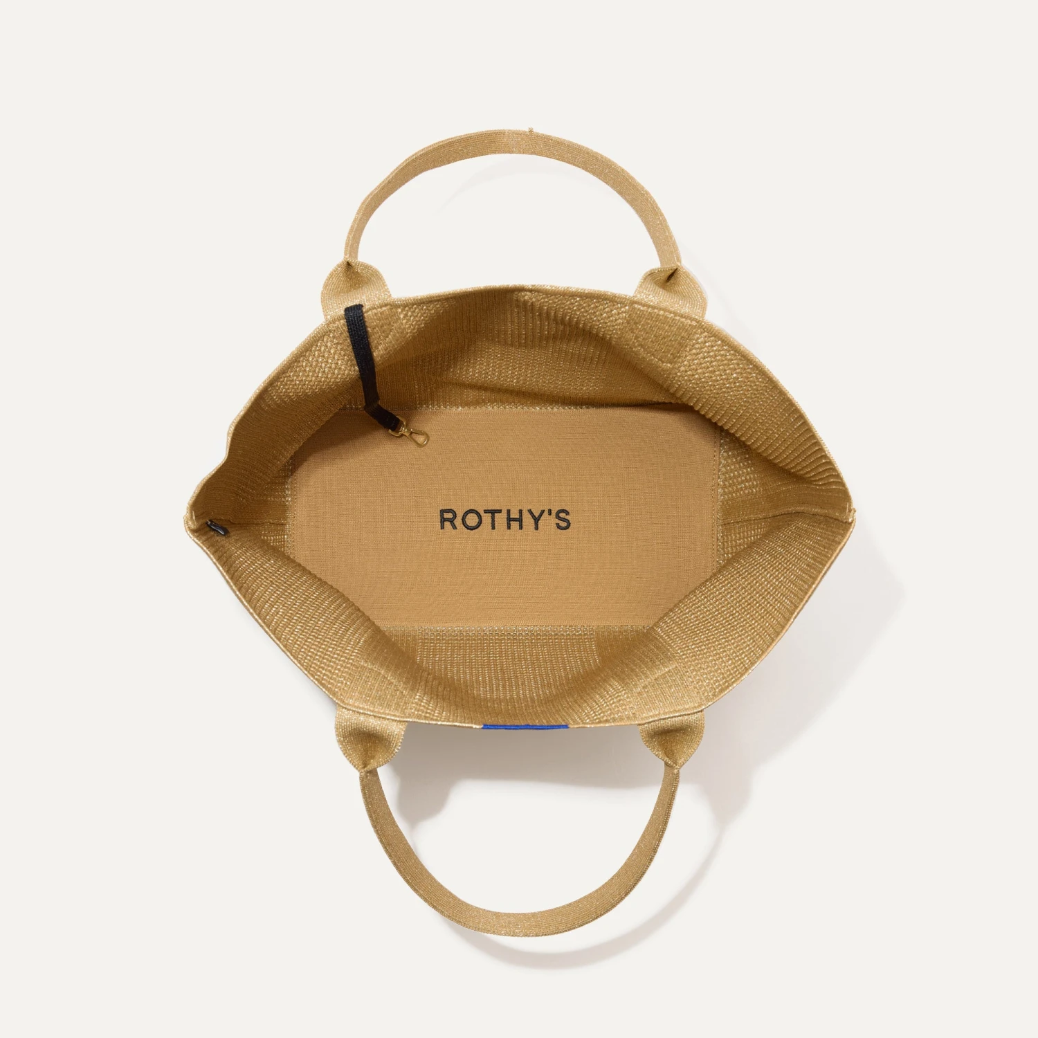 - Durable top handles in shimmery metallic gold fit comfortably over the shoulder.