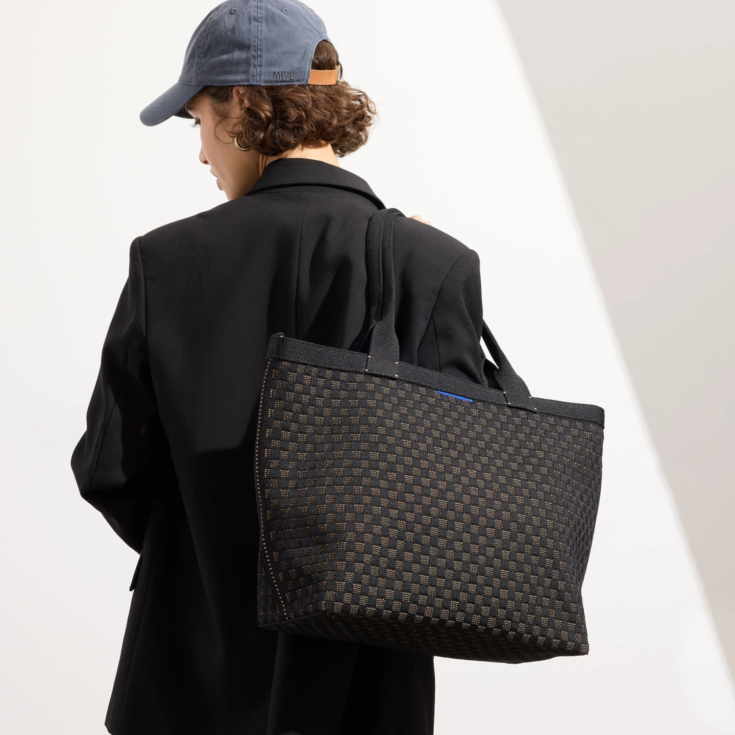 - Lightweight, flexible design in a black and camel basketweave pattern.
