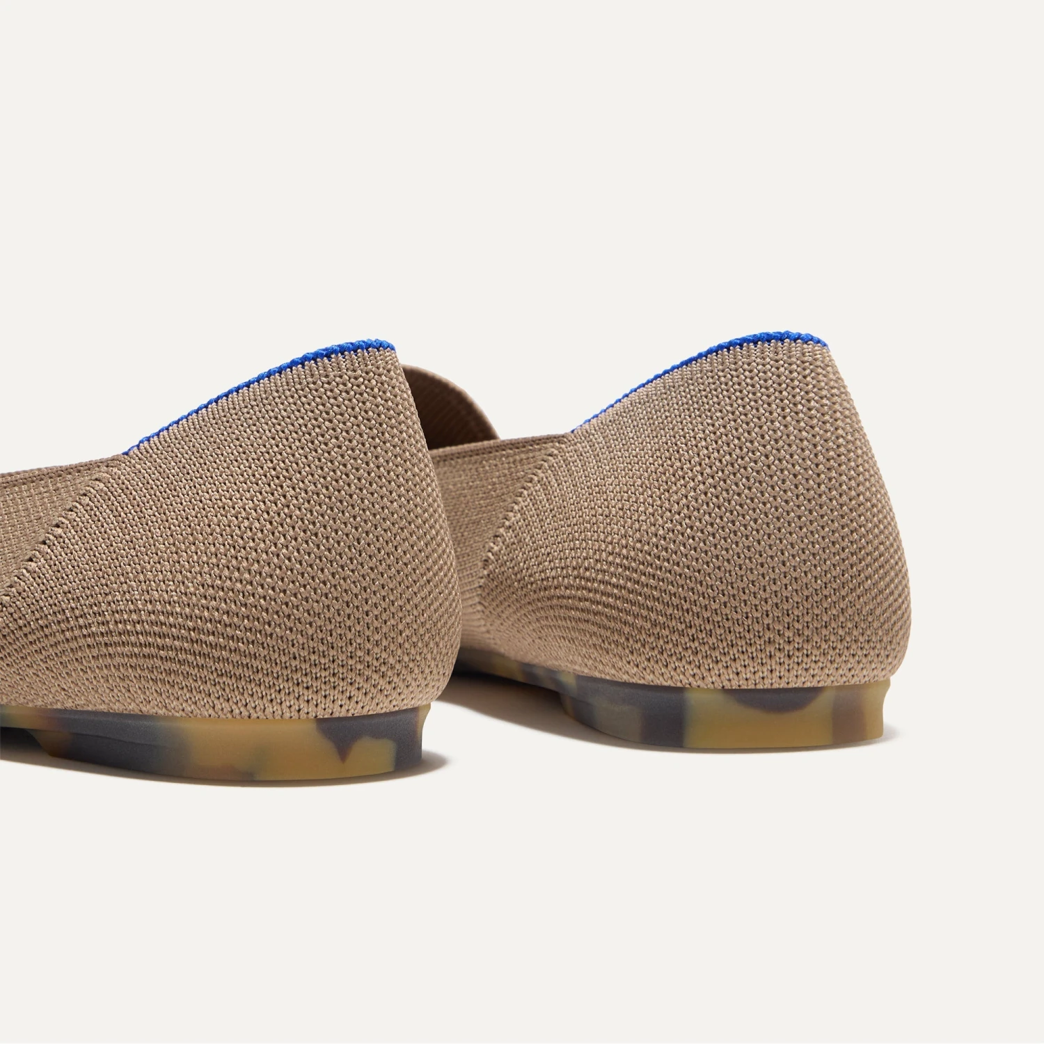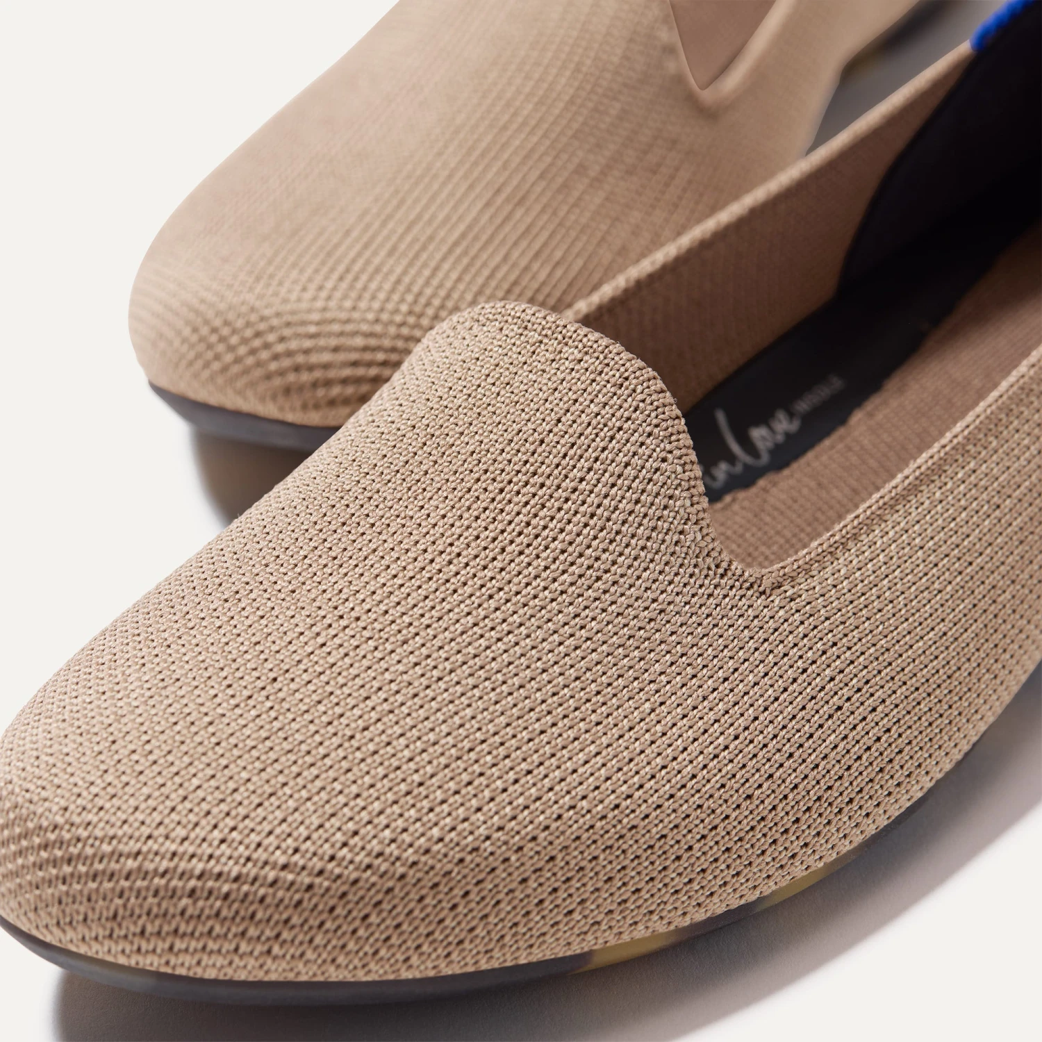 - Knit upper in greyish-brown, with a Venetian vamp and rounded toe box.