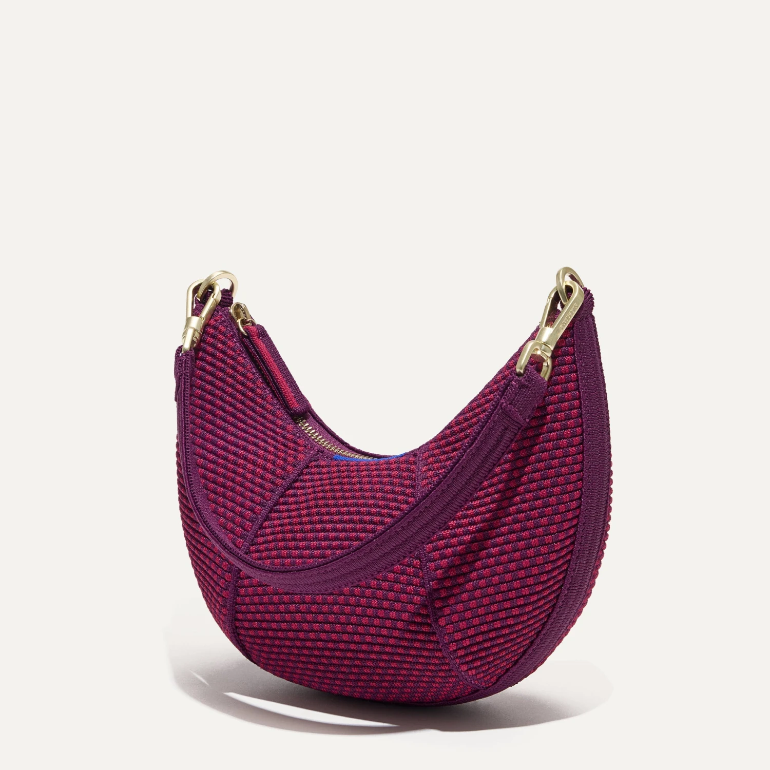 - Small, crescent shape style in a deep burgundy with burgundy piping.