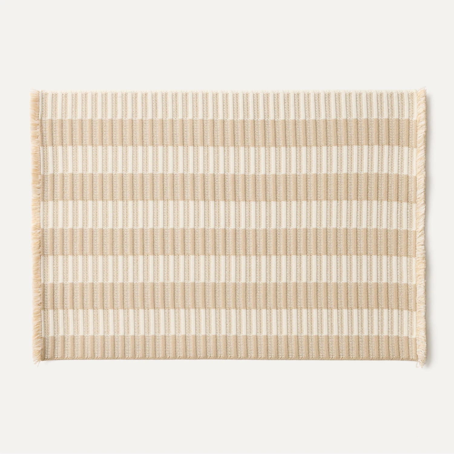 - Set of four placemats in ivory and beige stripes with fringed ends.
