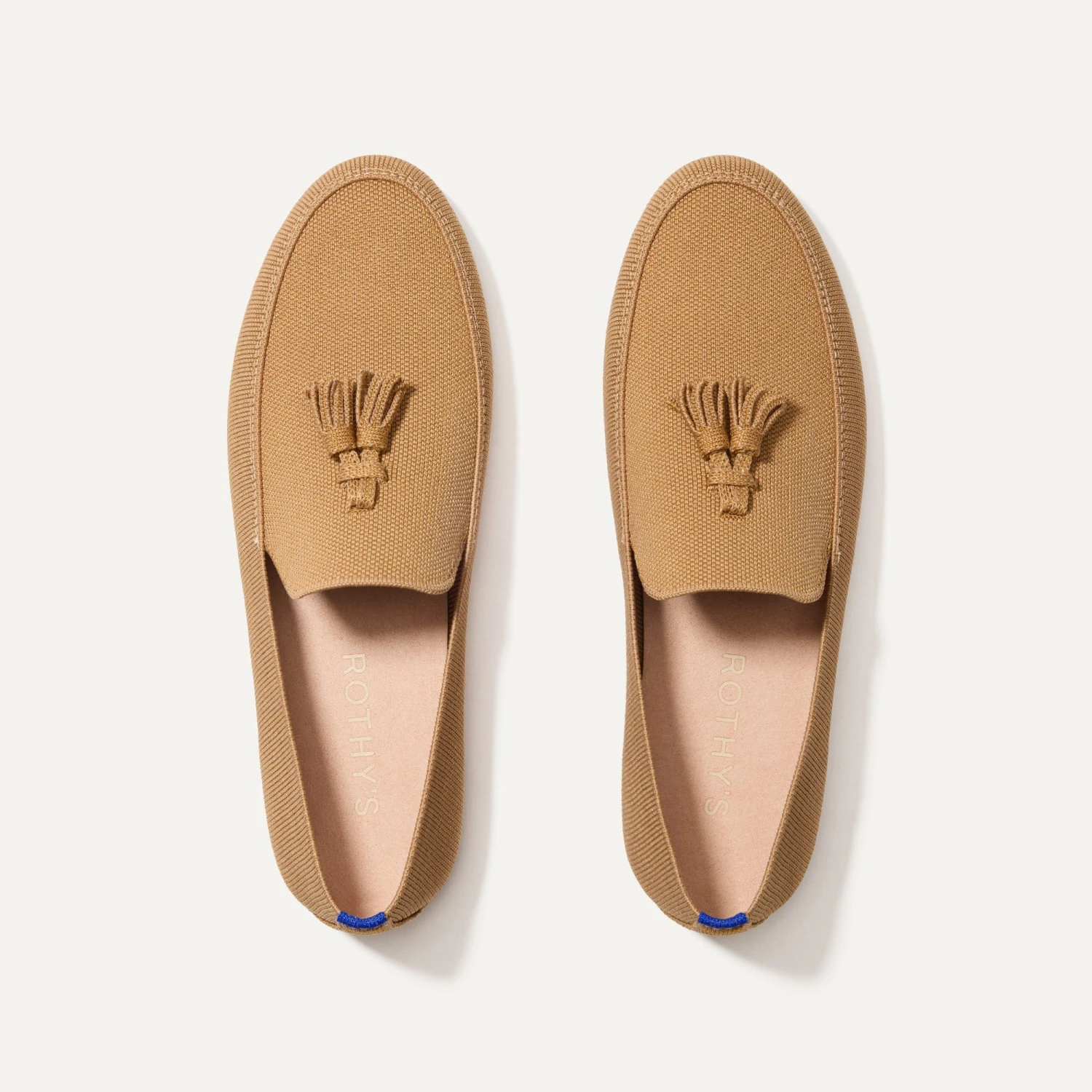 - Soft, flexible upper in a camel brown with a tassel embellishment on the vamp.