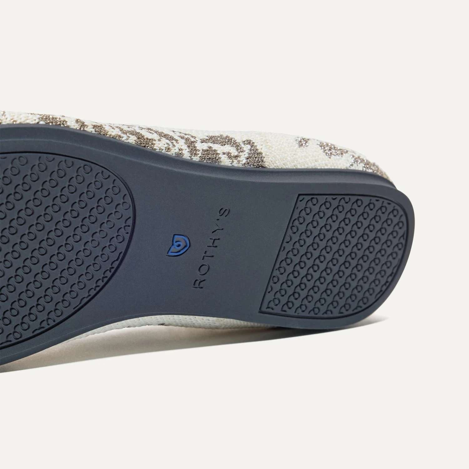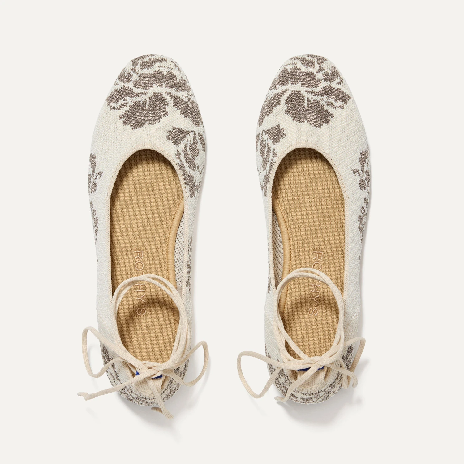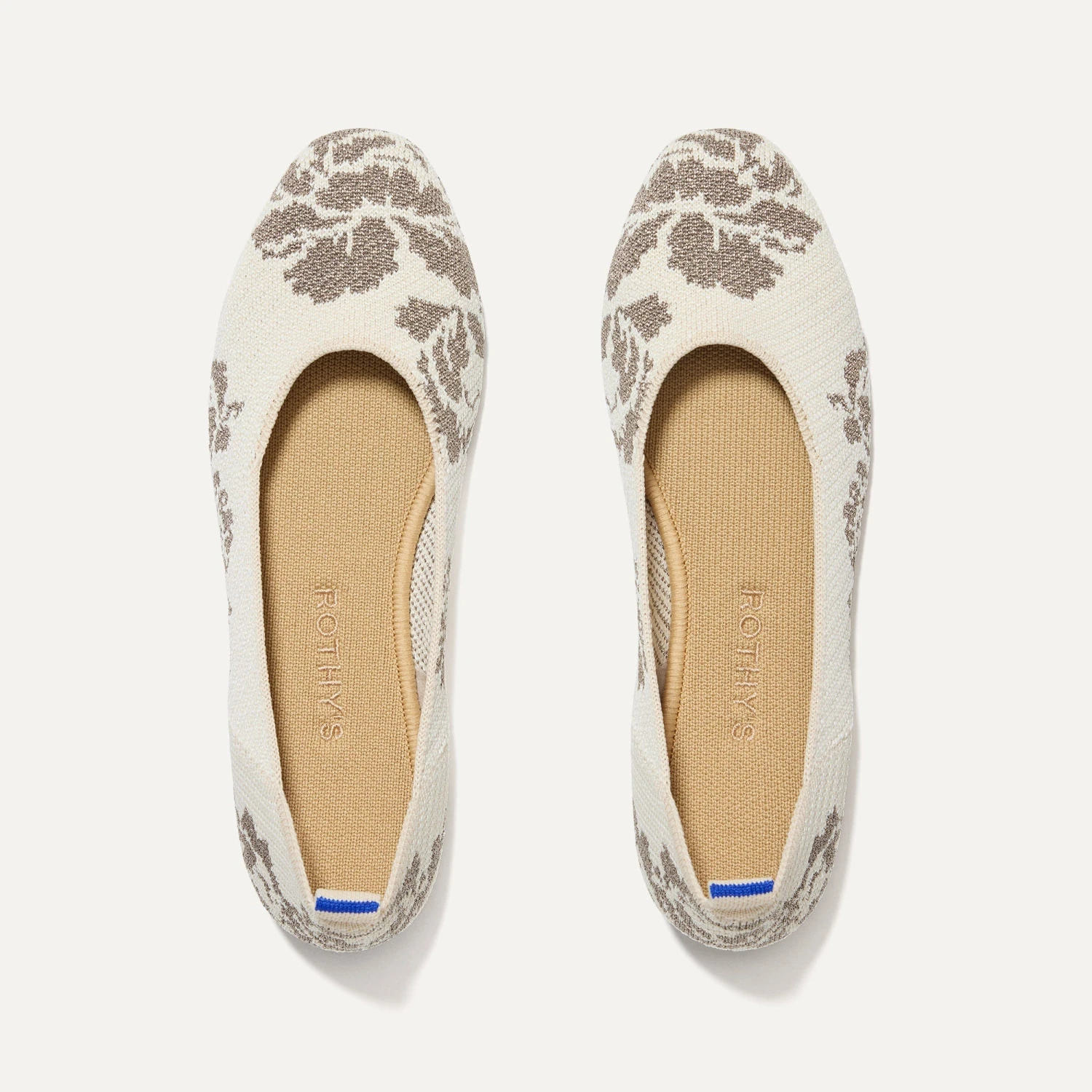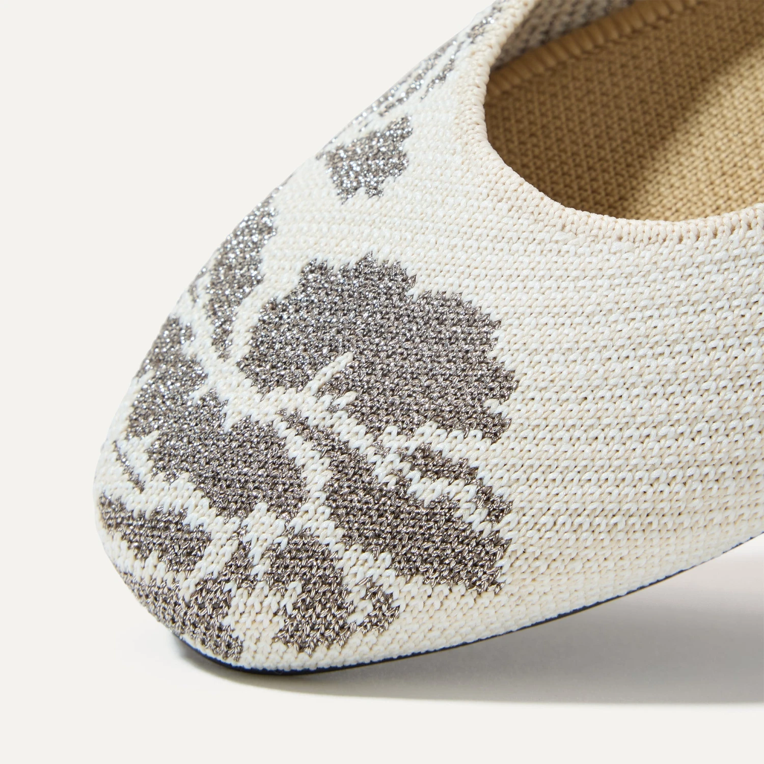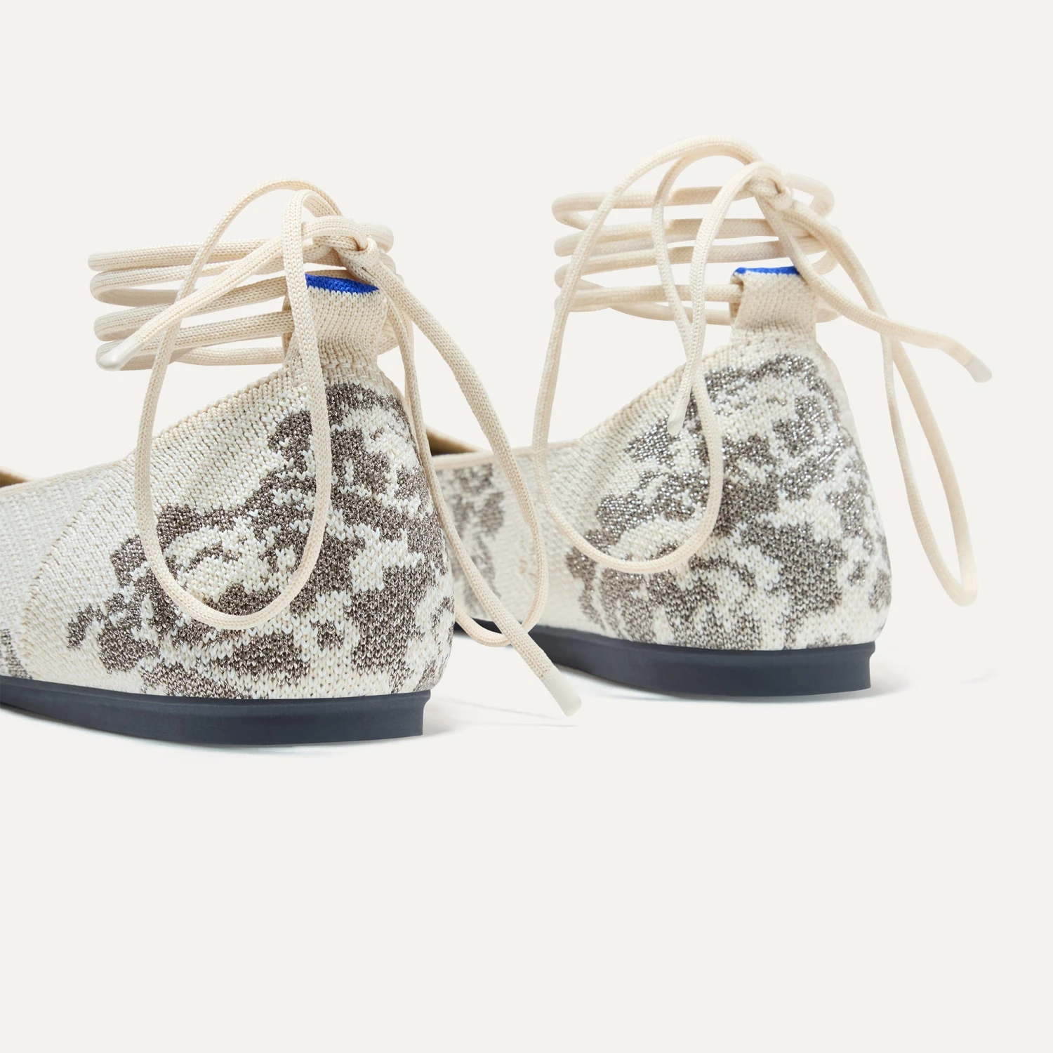 - Soft, flexible upper in ivory with a floral pattern in a shimmery metallic taupe.