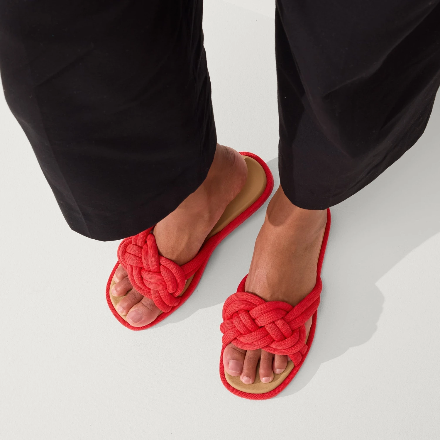 - Cushioned, interwoven straps in red for a luxe style you can wear all day.