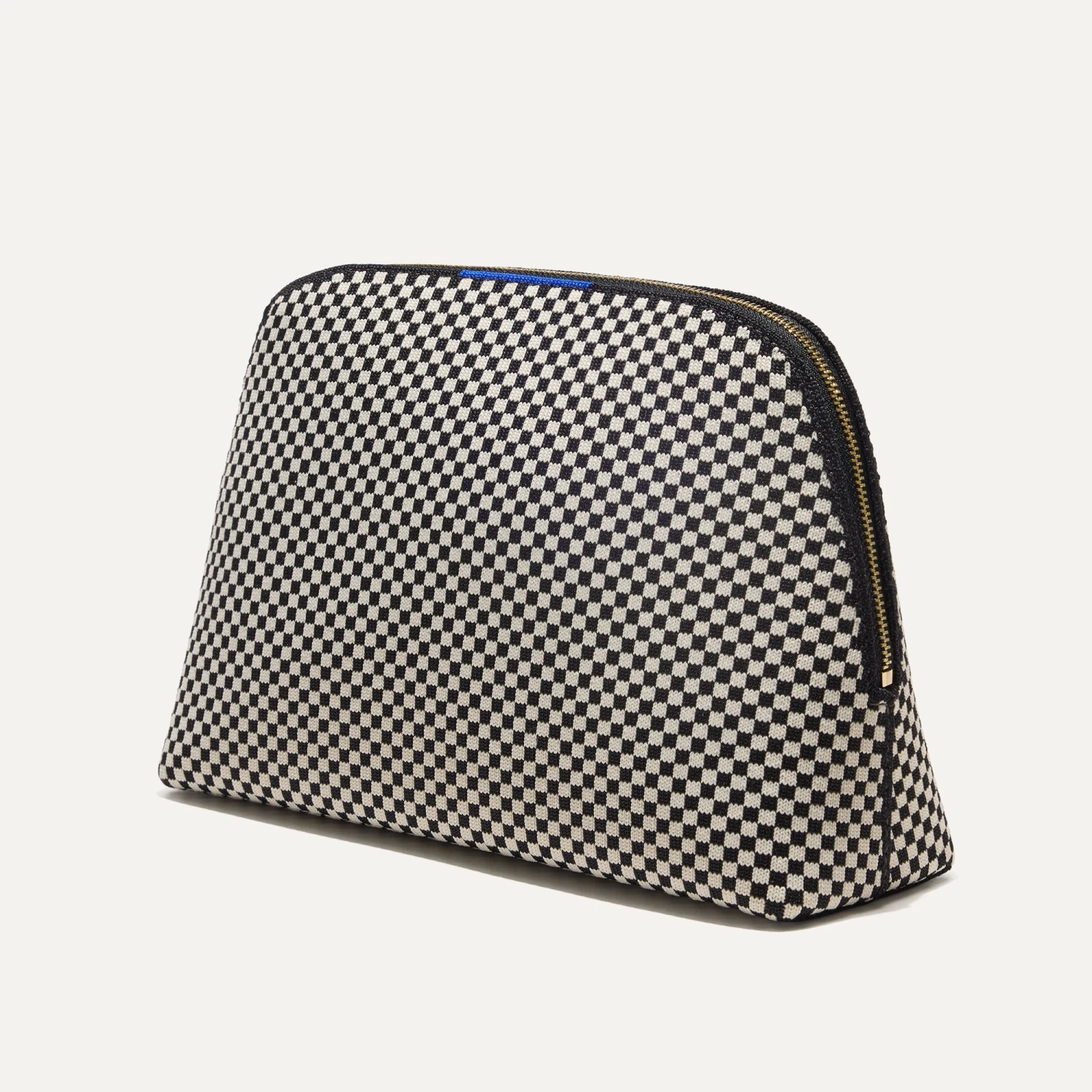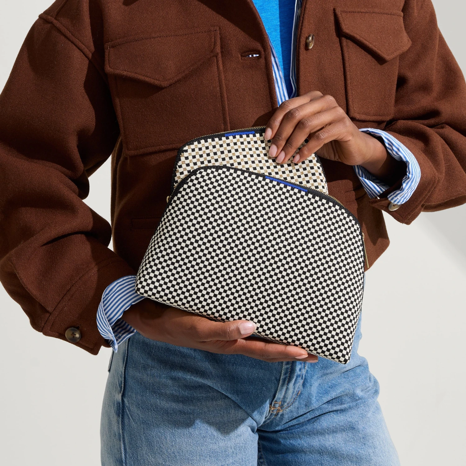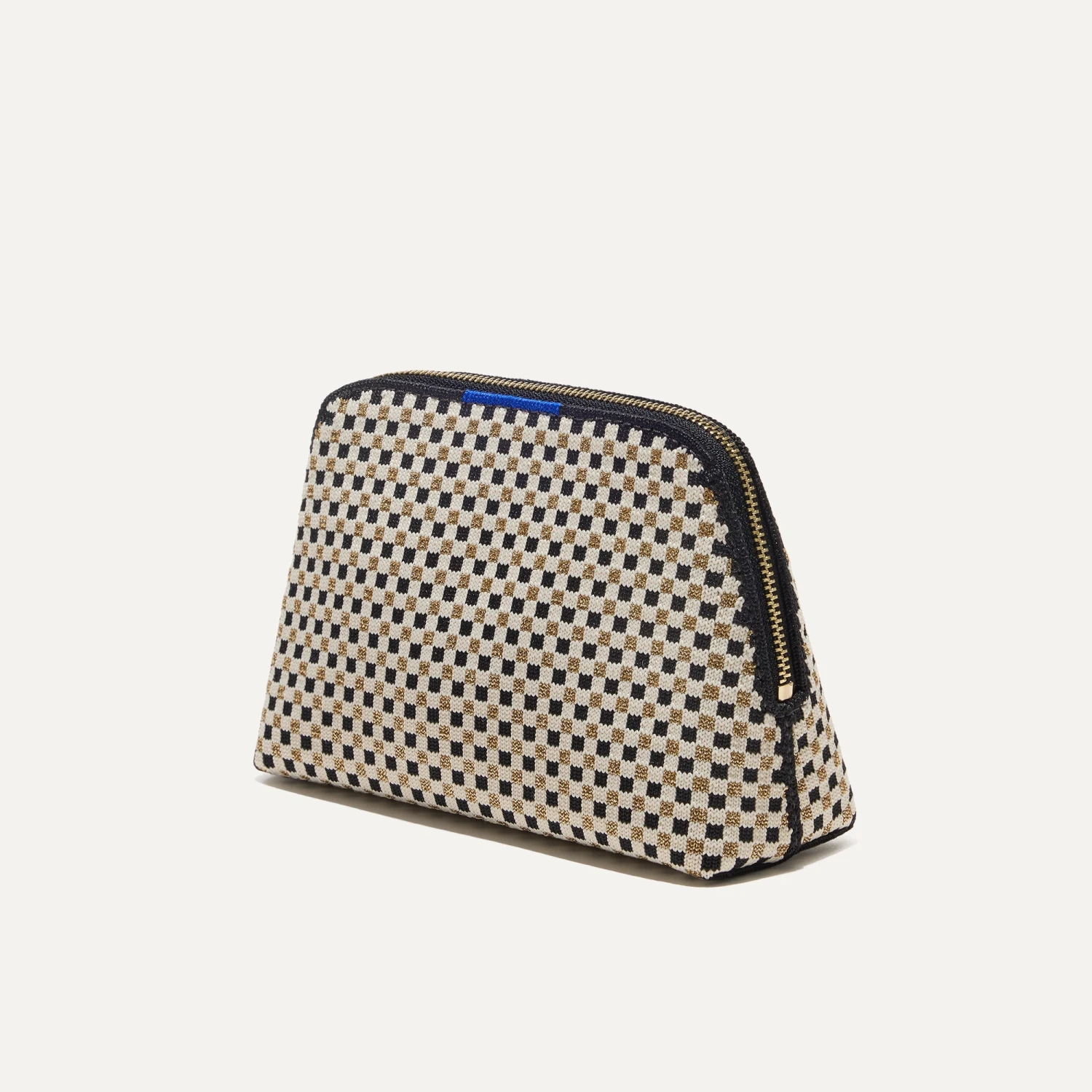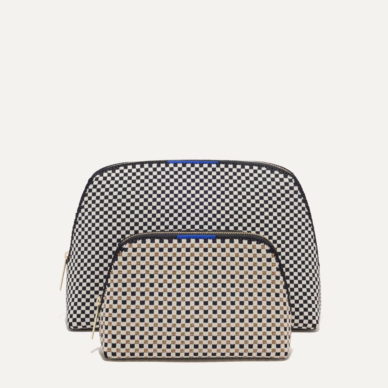 - Lightweight, structured style that keeps its shape. Small pouch comes in a black, ivory and shimmery gold micro checkered pattern and large pouch in a black and ivory micro checkered pattern.