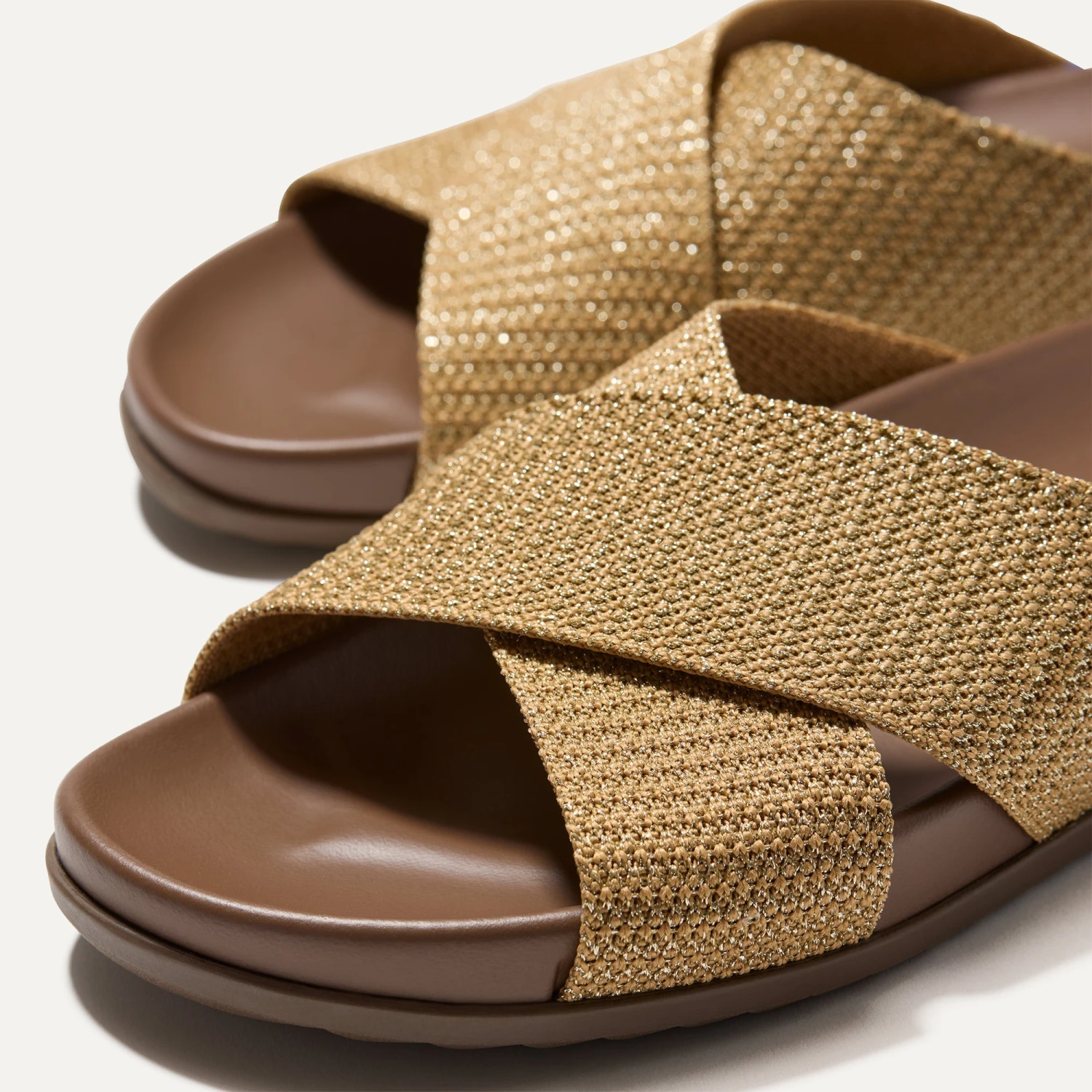 - Flexible upper features two wide crossing straps in a shimmery metallic bronze.