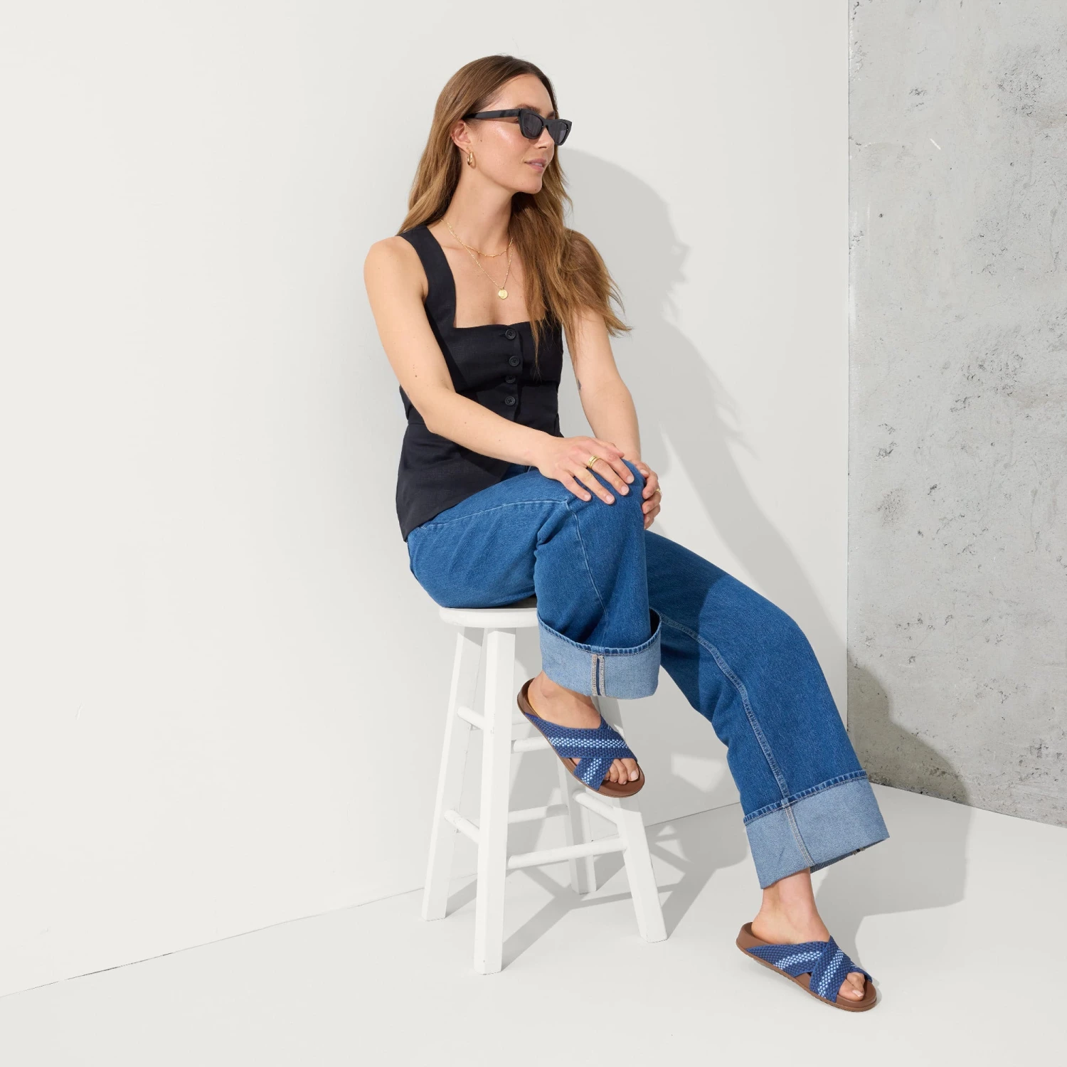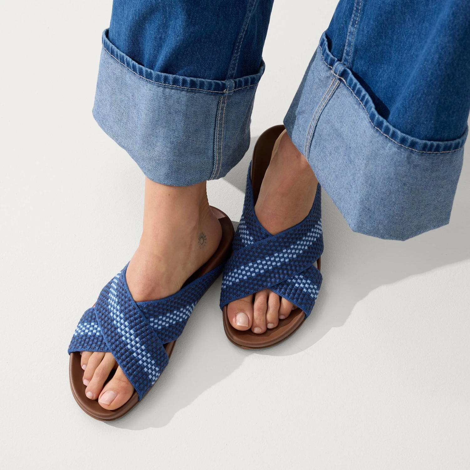 - Flexible upper in a natural hemp-textured weave with two wide crossing straps in indigo and navy blue.
