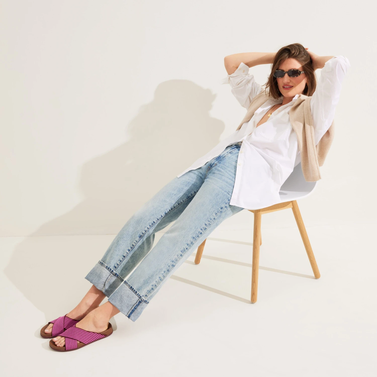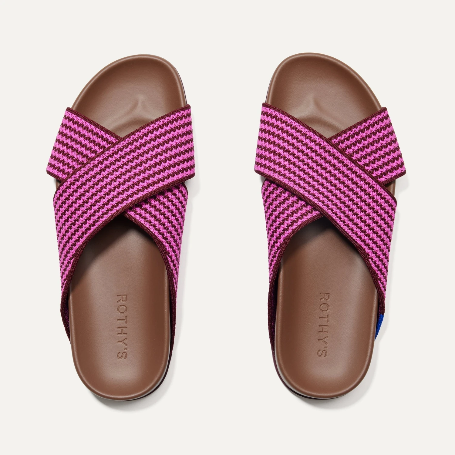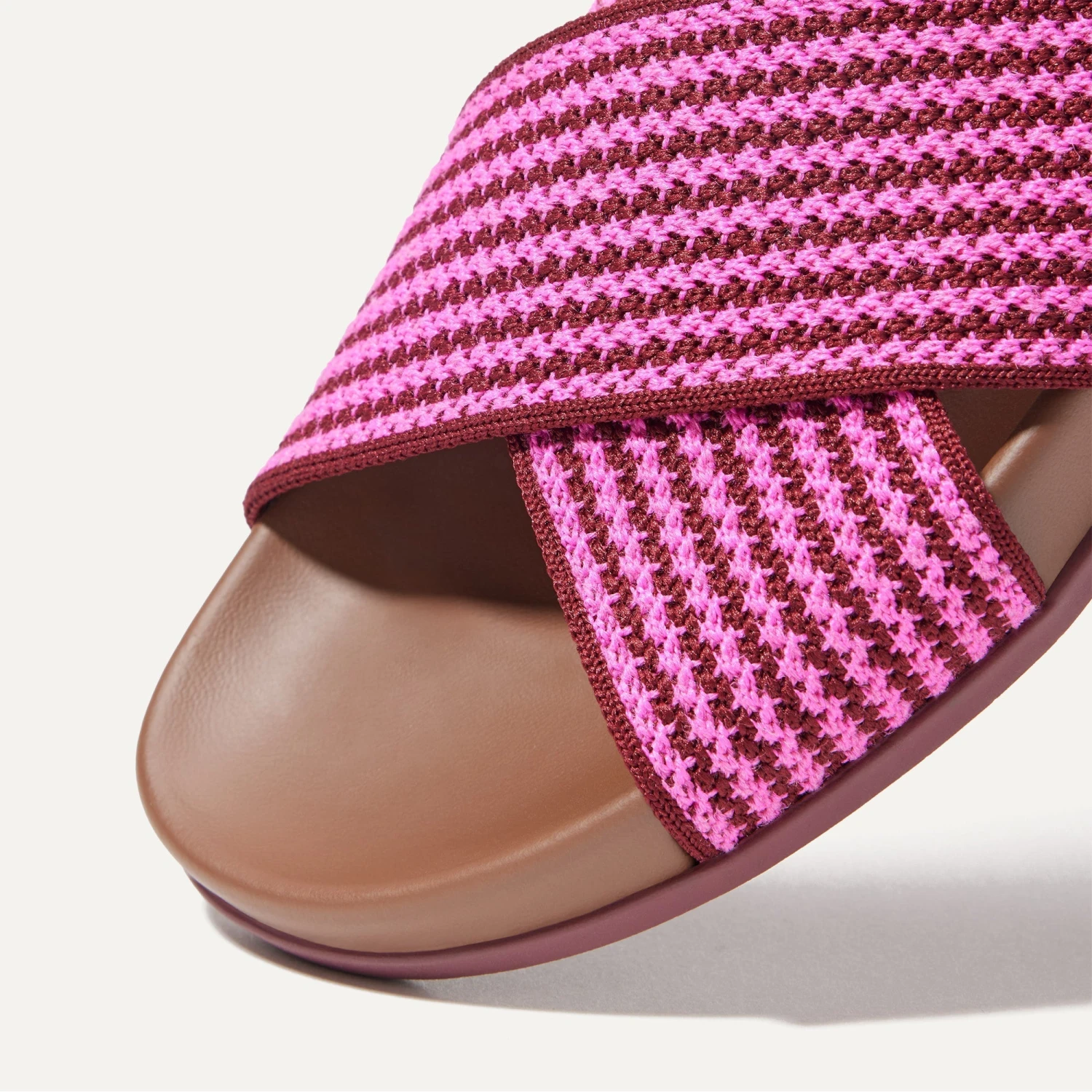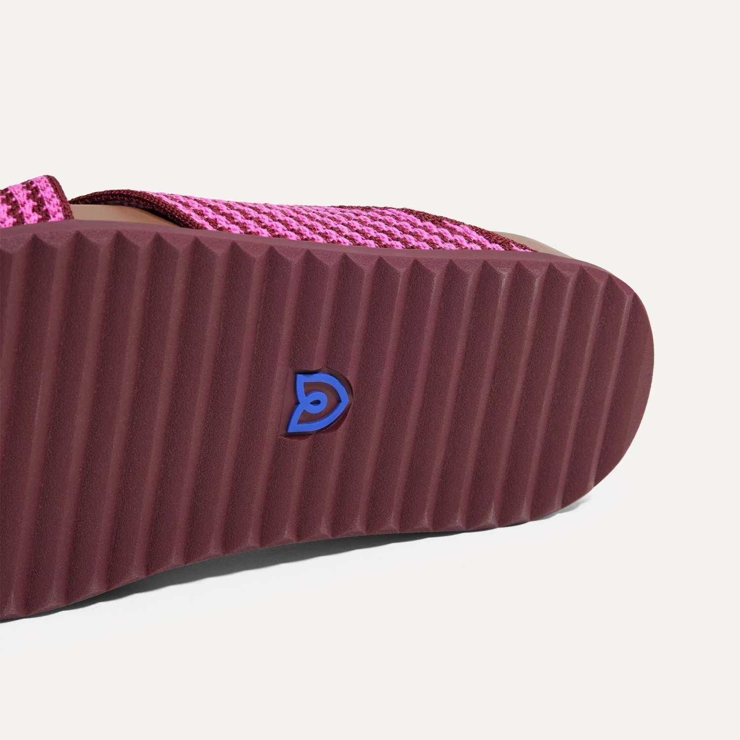 - Flexible upper knit with natural, breathable hemp and features two wide crossing straps in light magenta and burgundy.